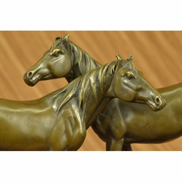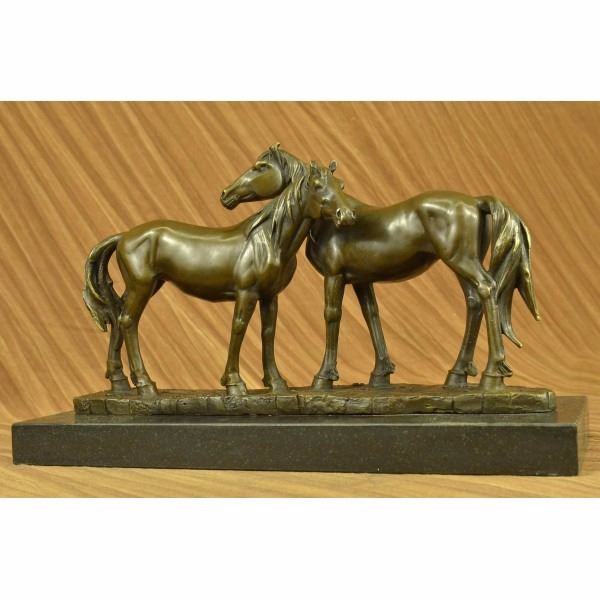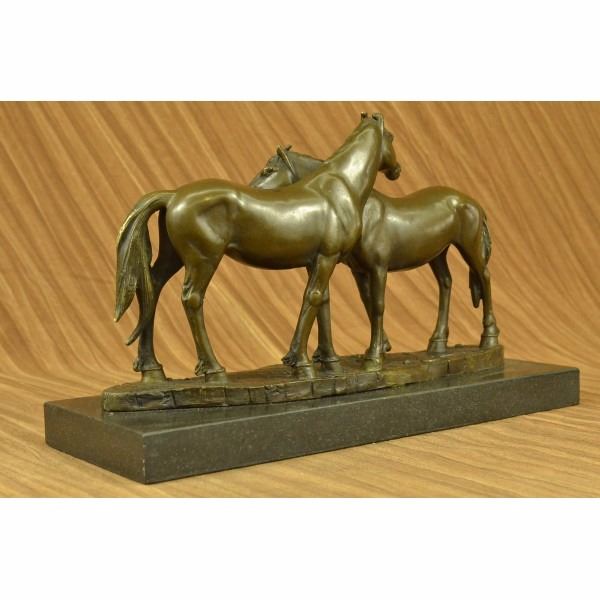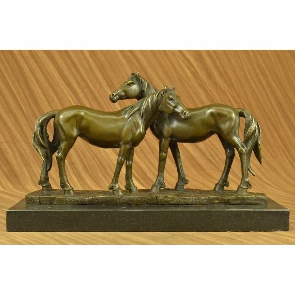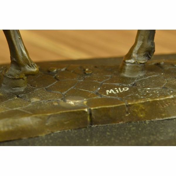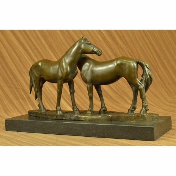 Works of art depicting the beautiful and elegant horse remain an extremely popular choice for visitors to Europeanbronze.com. Although the horses contact with man stems back 30,000 B.C., it was initially seen as a source of food. As time went on, however, man learned that the horse could be an extremely useful asset in everyday life. Whether the horse was used for transportation or simply to aid in hunting animals that man could not traditionally catch, this once hunted creature became vary valuable. The domestication of the horse was first seen around 3000 B.C. in China where horse drawn chariots were used in wars and invasions. The horse was highly popularized in the art of the Romans with numerous popular pieces depicting the anatomical features of the horse to more dynamic sculptures of battles and chariot races. The horse gained further recognition by the cowboys and American Indians of the wild west who relied so heavily on this creature for survival. In a more contemporary setting, the elegance of the sport of thoroughbred racing has put the horse on a pedestal above most other animals. Condition: This sculpture is in perfect condition. Bronze Dimensions with Marble Base:Height 9" x Width 15" Marble Dimensions: 15" X 5.5" . Height without base: 8" Weight : 21 LBS Inventory: 85YDW16358