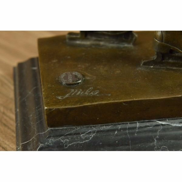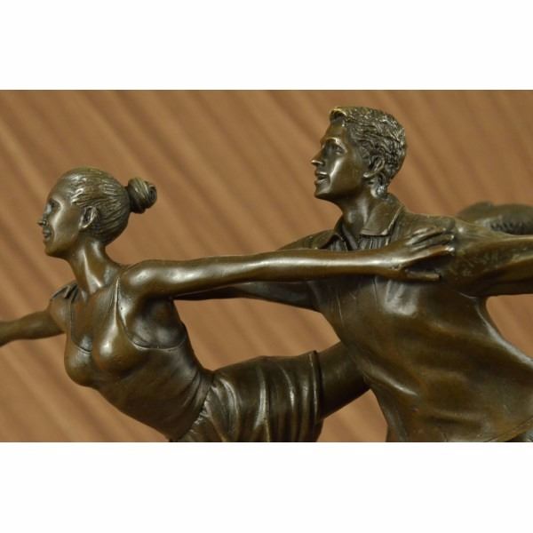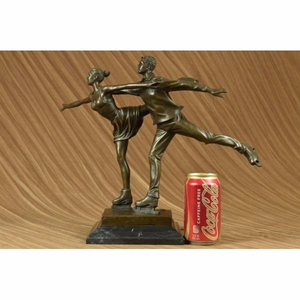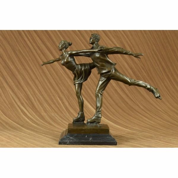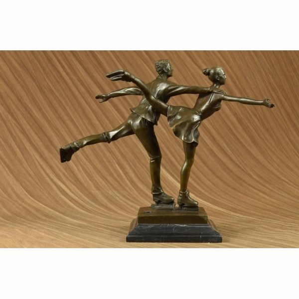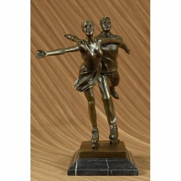 One of the most graceful sports, pairs figure skating has beenentertaining winter game lovers for ages. Pairs skaters performelements such as acrobatic lifts that are unique to pair skating,allthe while moving in perfect unison. Pair skating is difficult becauseachieving this degree of unison requires similar technique and timingon all elements of the performance, as well as ultimate trust betweenthe partners. What many may not know is that the sport has evolvedfrom it's classical roots to something far more daring. Some pairskating maneuvers are now banned from Olympic-eligible skating due totheir high risk of serious injury to the skaters. Illegal elementswarrant deductions in competition. These moves include theheart-stopping headbanger where the female skater is spun by herankles and elevated and lowered during the spin in a periodic fashion,sometimes with her head coming dangerously close to skimming the ice.These two skaters however, are a classical reminder of thesimpler-safer days of the sport. Happy and in all their glory, theyare doing what they do best SKATE! This perfect duo looks like theyare going for the gold. Both synchronized with skating moves anddressed to impress this couple give is their all. Both of their armsare straight and stiff to make sure they maintain balance. The girlextends her leg outwards and up showing off her amazing flexibilityand the man stretches his leg out and down. This piece is trulybeautiful and makes you smile. You feel the energy from this sculpturejust by looking at it. The couple both wears smiling faces and thesculpture expresses that they are having a magnificent time. Thedetail on the sculpture is amazing, since is uses a lot of itssurrounding space with a lot of diagonal lines it give the sculpturemotion. It was casted using the “Lost Wax Method†insuring the finestquality of detail. If you look closely you will notices the lacing onthe skates, the muscles contours such as were the thigh meets theknee, And even their hair. You can even see the neck muscles in thegirl and the Adams apple in the man’s neck. Every time you look at thesculpture you will find something new! This sculpture was handmade byMilo a notable Spanish artist and was casted using the “Lost WaxMethod†it sits on a black marble base.World famous sculptor "Milo" is the artistic partner of the LynnForbes School of Sculptureand is offering an exclusive signature inthe wax of every piece of his items that is Custom Cast with EuropeanBronze Finery. In effect it makes EACH SCULPTURE an ORIGINAL sinceeach one is different than the next (similar to a Limited Edition).Again, Miloour partnerIS THE ORIGINAL SCULPTOR of this incrediblework of art. Milo was born in Paris in 1939; Milo lived most of hischildhood in Andalusia, Spain. Influenced by an artistic familybackground, he began sculpting at the age of seventeen. Afterapprenticing with several accomplished sculptors both in America andSpain, he began his own work focusing equally on steel and bronze.Horses and other animals were a natural direction of his work tofollow. Surrounded by horses as a child and witnessing the fightingbulls of Spain gave him an instinct for the inherent drama of theseanimals. Combining a special cement mixture with steel has allowed himthe fluidity of metal with the timelessness of stone. This processenables him to capture the essence of the animal's nature. Thecharacteristic rough texture and movement of line make Milo workeasily identifiable in both cement and bronze. Condition: This sculpture is in perfect condition. Bronze Dimensions with Marble Base:Height 14" x Width 17 1/2" Marble Dimensions: 6 1/2" x 6" . Height without base: 13" Weight : 14 LBS Inventory :2366B38832