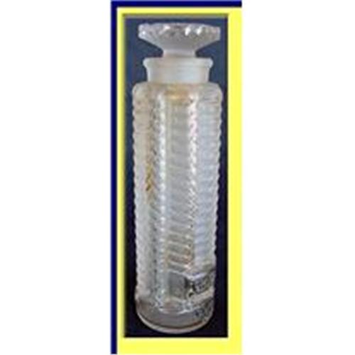 ROund bottle deeply moulded in a zig-zag imbedded pattern with the ridges of each zig-zag cut in a diamond pattern. This is reflected in the shoulders, which are a series of jutting out diamond shapes, slightly 'bent' or curved to echo the round shape. Also echoed, on a smaller scale by the outside of the stopper. The top of the stopper / lid has a curved cut pattern, which reinforces the sense of a round swirling machine.