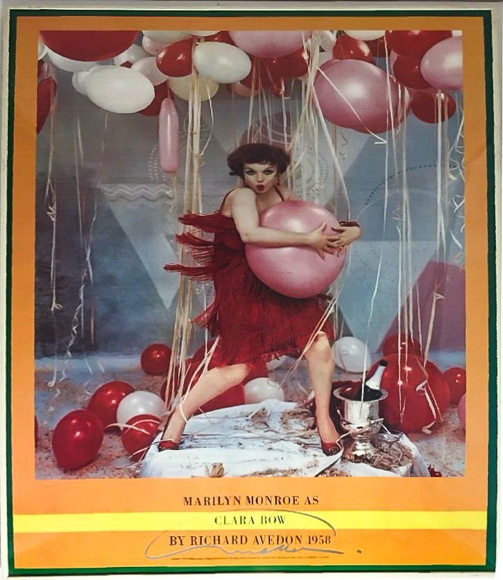 A FRAMED RICHARD AVEDON AMERICAN FASHION AND PORTRAIT PHOTOGRAPHER SIGNED POSTER OF MARILYN MONROE AS CLARA BOW. MEASURING 20X28 INCHES.