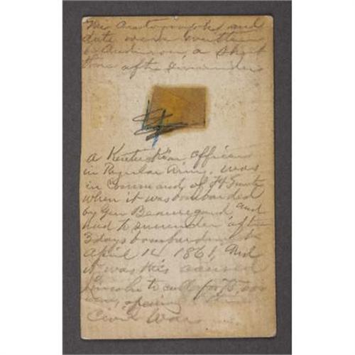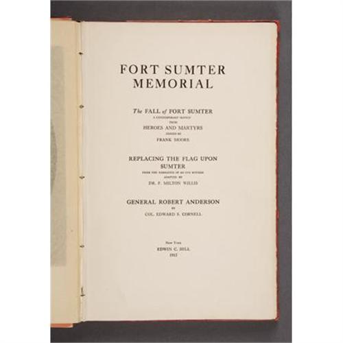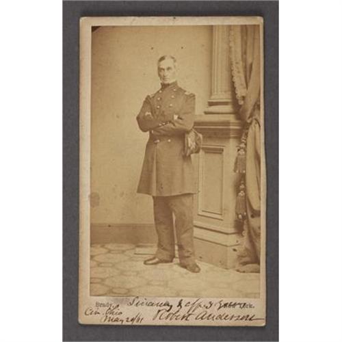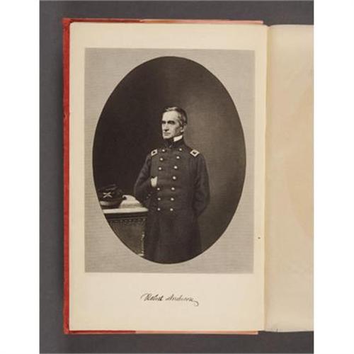 <B>SIGNED ROBERT ANDERSON CDV AND LIMITED EDITION FORT SUMTER BOOK.</B></I> A handsome Brady image of Robert Anderson, the Union officer in command of Fort Sumter at the beginning of the Civil War, standing in uniform with arms folded holding his kepi at his side. Inscribed the month following the fall of Fort Sumter. The 1st Artillery insignia is clearly visible on the front of the kepi. There is an old penciled biographical sketch of Anderson on the verso. The image has slightly toned, slightly soiled at the edges, and there is a bit of old adhesive tape on the verso, else it is in very good condition. Anderson has signed and dated the CDV at the lower edge: “<I>Sincerely & affectionately yours Robert Anderson Cin. Ohio May 26/61</B></I>”. The image is sold with a limited edition copy of <I>Fort Sumter Memorial</B></I> (New York: Edwin C. Hill, 1915), limited to 750 copies, 65 pages, illustrated, salmon colored boards with maroon cloth shelf back, paper title label on spine, 4to (7.25” x 11”), significant shelf wear especially at the corners, head and foot of spine, some light ex-library pencil marks, ex-lib book plate on the front pastedown, hinges starting, else good condition. The CDV of Anderson was at one time taped to the memorial dedication page but has since come loose. Rather than being reviled for surrendering Fort Sumter, Anderson became something of a hero and this book certainly elevates him to that status.<BR><BR><b>Shipping:</b> Books & Catalogs (<a target="_blank" href="http://www.heritageauctions.com/common/shipping.php">view shipping information</a>)