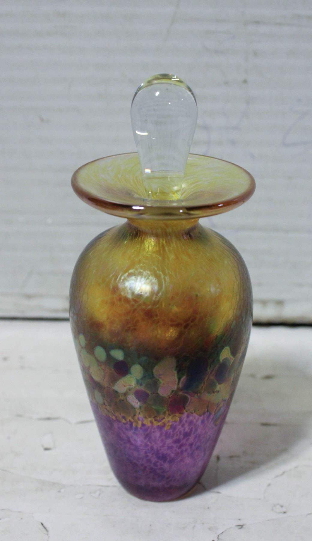 - SIGNED "R. HELD" ON THE BOTTOM OUTSIDE, IRIDESCENT AMBER & PURPLE WITH PEARLY PINK & GREEN, 5" HEIGHT