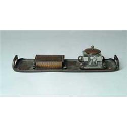 Lot 979 SIGNED ROYCROFT DESK SET. Exceptional Roycroft desk set features a hand hammered handled tray with attached hammered copper bands with curled ends which holds in place a clear glass inkwell with hammered copper lid. Other end of tray has hammered copper bands which hold in place a hammered copper stamp box. Tray and stamp box are marked with Roycroft orb mark. SIZE: 14" l x 4" w. CONDITION: Very good to excellent. 5-68568 (800-1,200)