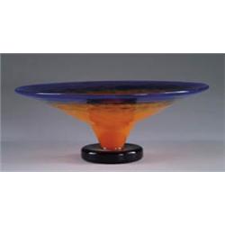 Lot 847 SIGNED SCHNEIDER COMPOTE Beautiful Art Deco compote has black disk foot with flaring bowl of mottled orange shading to cobalt blue. Signed on side of foot “Schneider”. SIZE: 8-3/4” dia. CONDITION: Very good to excellent. 5-71078