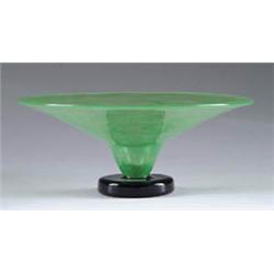 Lot 848 SIGNED SCHNEIDER COMPOTE Pretty Art Deco compote has black disk foot with mottled green bowl flaring upward. Bowl has controlled bubbles throughout. Signed on side of foot “Schneider”. SIZE: 8” dia. CONDITION: Very good to excellent. 5-71079