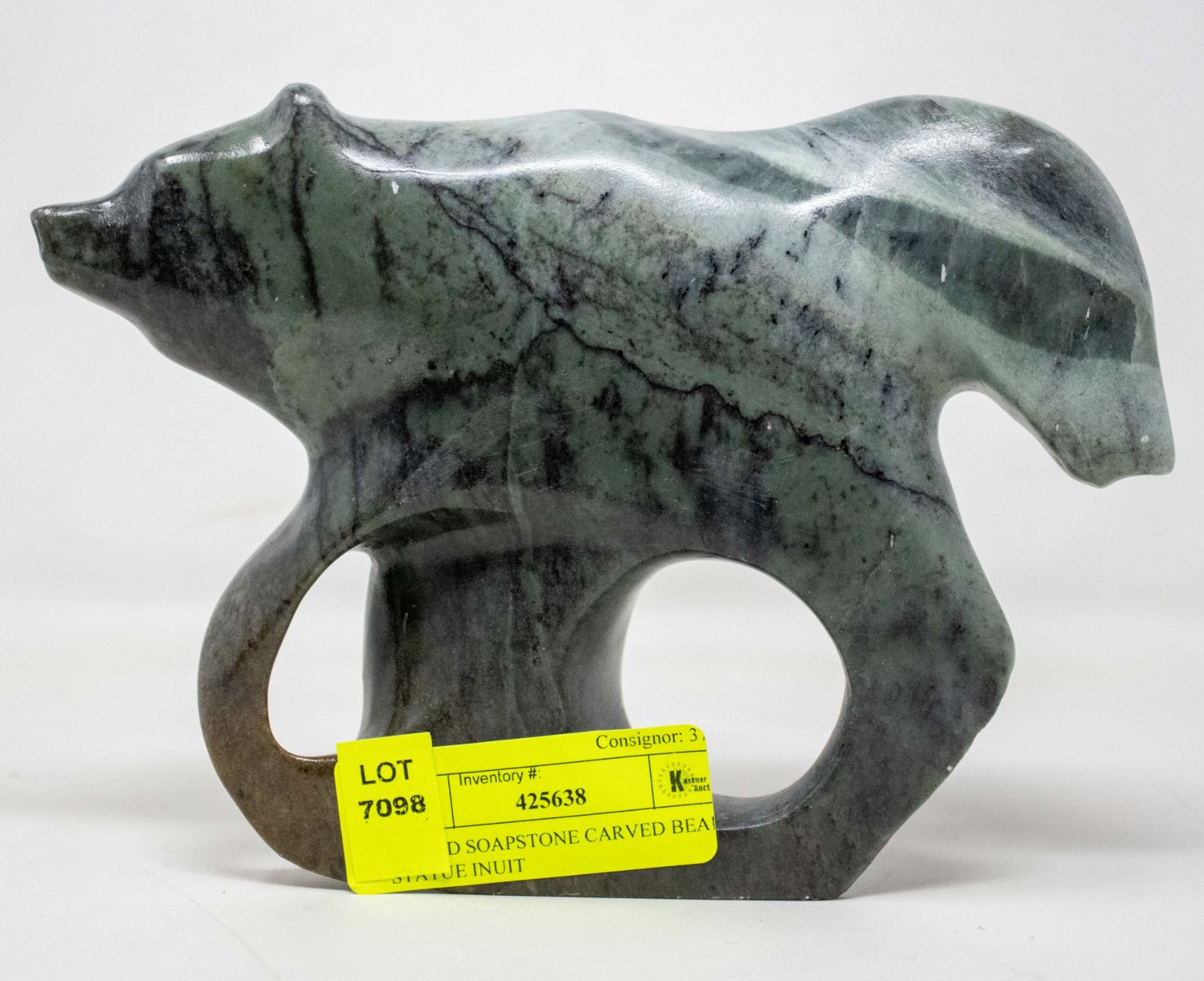 SIGNED SOAPSTONE CARVED BEAR STATUE INUIT