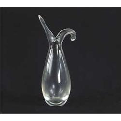 Lot 269 SIGNED STEUBEN EWERSIGNED STEUBEN EWER. Beautiful blown ewer is done in unique, stylized modern design. Signed on underside in script “Steuben”. SIZE: 9-3/4” t. CONDITION: Very good to excellent. 12-333 (100-200)