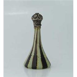 Lot 1025 SIGNED TIFFANY SCENT BOTTLE. Laminated glass, striped bottle with original silver top. Signed “L.C. Tiffany Favrile”. SIZE: 4” t. CONDITION: Very good to excellent. 5-69259 (1,000-1,500)