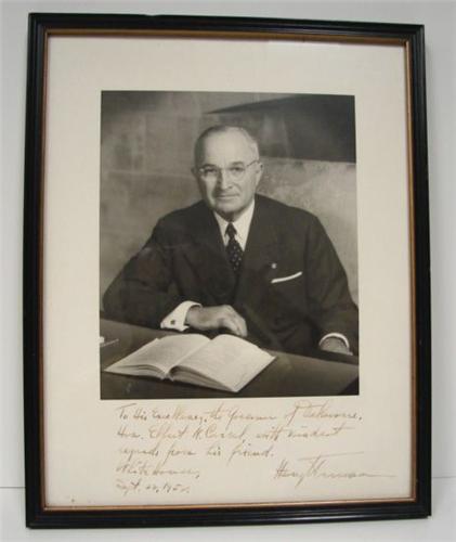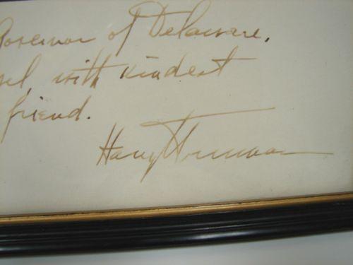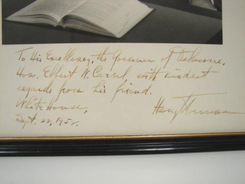 FRAMED & SIGNED HARRY TRUMAN PHOTOGRAPH. From the Estate of Governor & Mrs. Elbert N. Carvel (Governor of Delaware 1949-1953, 1961-1965). Depicts a seated Harry Truman. Signed at bottom of photograph on matting "To His Excellency, the Governor of Delaware,/Hon. Elbert N. Carvel, with ?/regards from his friend./White House,/Sept. 22, 1952/Harry Truman". 11.75" x 14.75" framed.