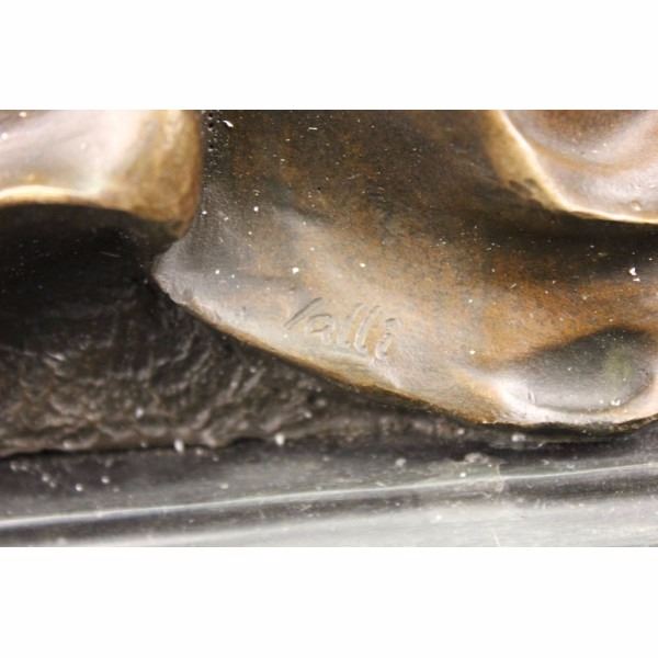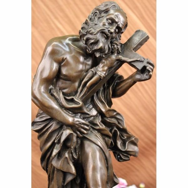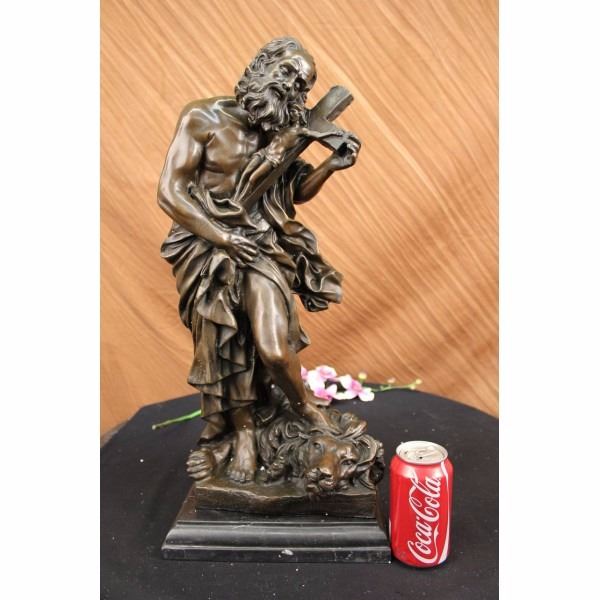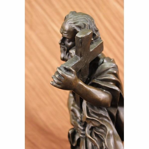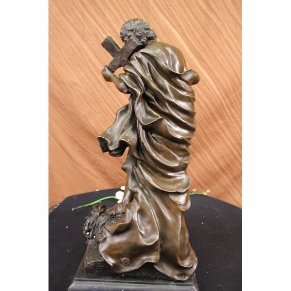 The bronze sculpture contains multiple religious meanings. Here we see Judas Iscariot, who was according to the New Testament, one of the twelve disciples of Jesus. He is notoriously known for his betrayal of Jesus to the hands of the chief priests for 30 pieces of silver. He seen walking in wretchedness, holding on to remorse and the symbol of Jesus crucified on the cross due to his betrayal. His foot falls heavy, crushing the lion's head which represents Jesus Christ as the lion from the tribe of Judah, which stems from the root of David and his lineage. The handmade bronze sculpture was cast using the archaic method of lost-wax casting and stained with a brown patina finish for preservation. It is mounted upon a black marble base with the European Bronze Finery stamp of quality and the artist Valli's signature. Condition: This sculpture is in perfect condition. Bronze Dimensions with Marble Base:Height 22 1/2" x Width 10" Marble Dimensions: 10' X 7 1/2" . Height without base: 21" Weight : 32 LBS Inventory:19Y12413491