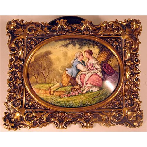 </font></strong>Superb 19th C Austrian Viennese enamel of a courting couple. In a most unusual brass fame that may actually be part of the enamel itself. Very rococco frame and signed CSK. Signed on the back of the frame Csengery. Nice Austrian work circa 1840. Frame is 7" across and enamel is 5" across, quality work with no damage.</font>