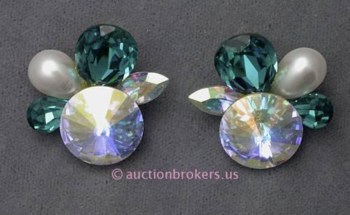 SIGNED VINTAGE FASHION CLIP STYLE EARRINGS BY NELLY IN COLORED AND IRIDESCENT STONES. THESE VINTAGE PIECES HAVE BEEN WELL CARED FOR IN A SAFETY DEPOSIT BOX.