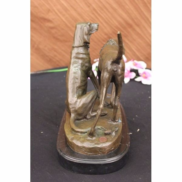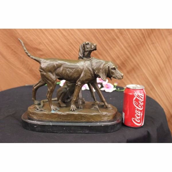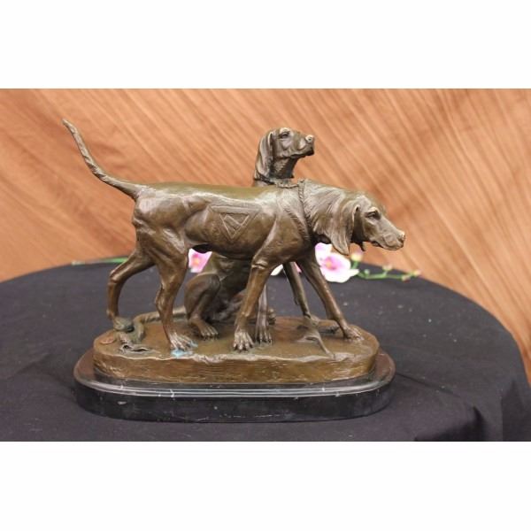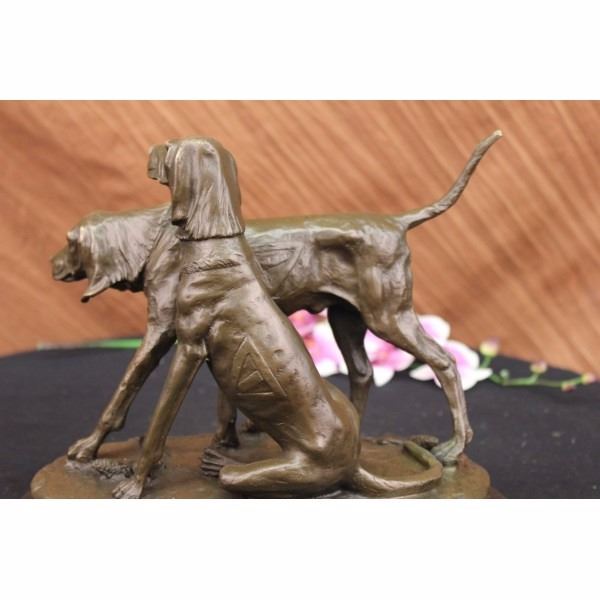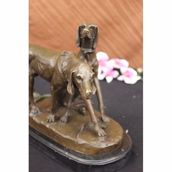 SPLENDID PAIR OF HUNTING DOGS BRONZE SCULPTURE: features a fine group of alert pointers was originally cast circa 1890. Our casting was made using the finest pure bronze in the hands of the experienced artisans working in our art foundry in Europe. Beautifully detailed and features a deep, rich patina finish fused into the bronze itself so that it will endure for hundreds of years. The piece is mounted onto a marble base, stands 10.5 high by 18 wide, and is signed E. Lemaitre and titled in the bronze. This is a beautiful work of art . A stunning piece at a very affordable price. This piece is in excellent Condition and is Highly desirable. This item is available for a limited time only so act now.Height 10 1/2"Length 12 1/2"width: 7"Inventory: 2570L11652 SPLENDID PAIR OF HUNTING DOGS BRONZE SCULPTURE: features a fine group of alert pointers was originally cast circa 1890. Our casting was made using the finest pure bronze in the hands of the experienced artisans working in our art foundry in Europe. Beautifully detailed and features a deep, rich patina finish fused into the bronze itself so that it
