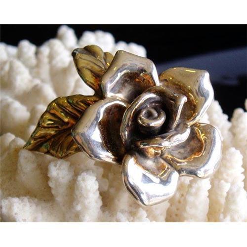 Gorgeous hand made sterling silver ROSE brooch with gold wash leaves. Excellent condition, reverse side stamped "925" and signed "??????".