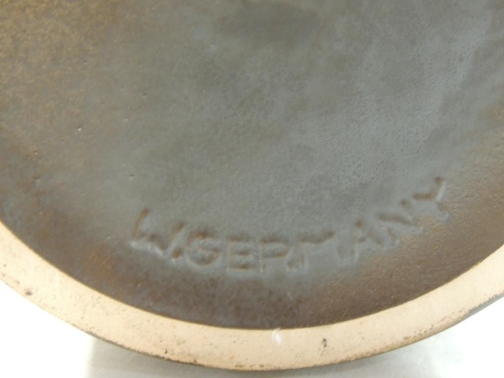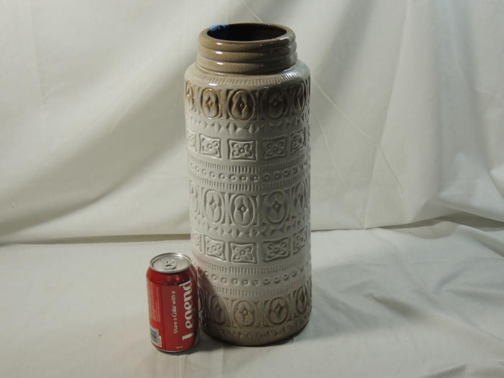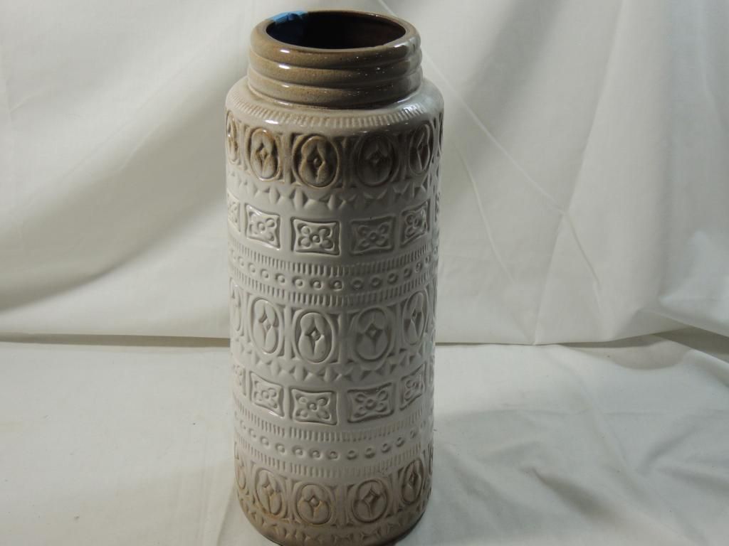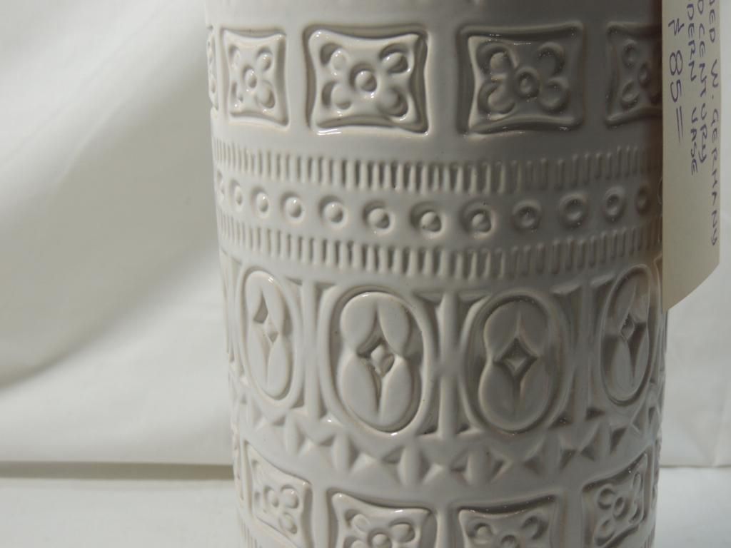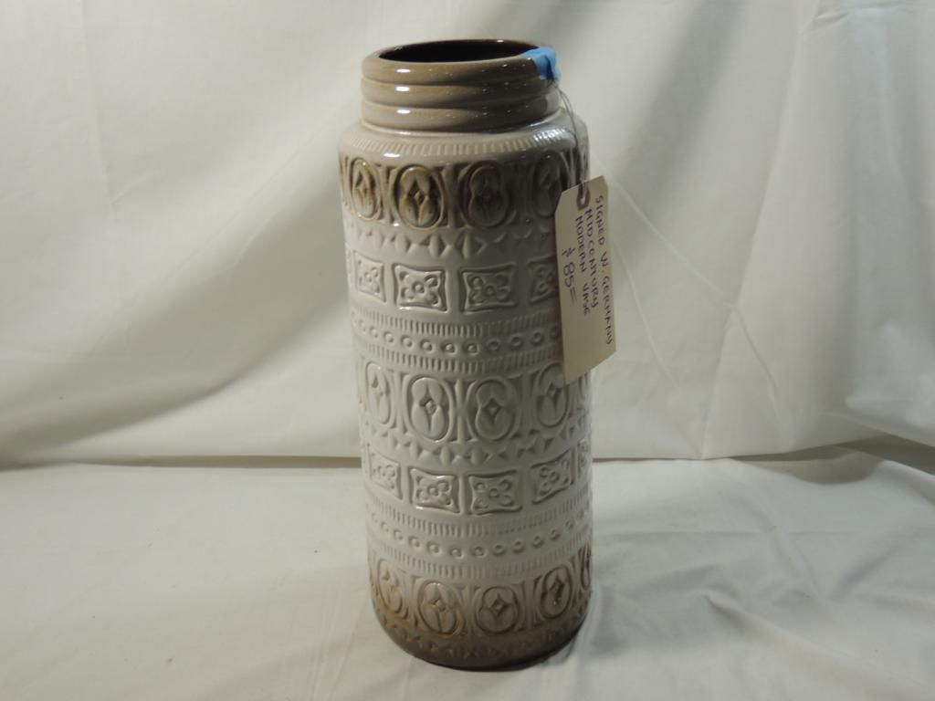 SIGNED W. GERMANY MID CENTURY MODERN VASE. TALL VASE WHITE TAN BROWN. DECORATIVE DETAIL. PATTERNED PRINT. AS SHOWN. SEE PHOTO FOR MORE DETAILS.
