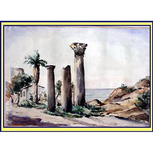 Signed original watercolour painting depicting ancient Roman ruins against a seascape backdrop.<BR>A small white house amidst Palm trees and a dirt path.<BR>Artist is Galili (signed in Hebrew).<BR>Measurements: 19 1/2 X 13inches. <BR>Painting is at least 25 years old. In original old frame, but no glass.