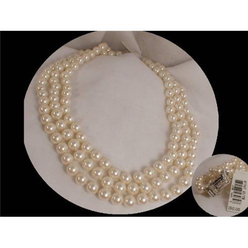 Right out of New York, these still have the original store tag of $150.00. They have never been worn either. If you have ever owned a pair of Carolee pearl color glass beads you will know they are of the highest quality and durability.They are hand knotted between every pearl color glass bead. These are LARGE pearl color glass bead too (about 10mm) and soft white. These are three heavy strands with a thick rhinestone clasp. The shortest strand is 15". Once you try these on you will know what I mean about quality and why Bloomingdale?s sells them for so much.