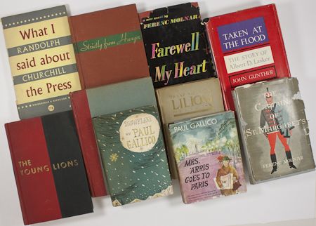 Lot of ten books by prominent authors, all inscribed to prominent film and theater columnist Leonard Lyons (author of "The Lyons Den"). Includes: FERENC MOLNAR, three books, Liliom, (Liveright Publishing Corp., New York, 1935), The Captain of St. Margaret's, (Duell, Sloan & Pearce, New York, 1945); and Farewell My Heart, (Simon & Schuster, New York, 1945); PAUL GALLICO, Snowflake, (Michael Joseph, Ltd., London, 1952), and Mrs. 'Arris Goes to Paris, (Doubleday & Co., New York, 1958); S. J. PERELMAN Strictly From Hunger, (Random House, New York, 1937), note tipped-in, toned; JOHN GUNTHER, Taken at the Flood, (Harper Bros., New York, 1960); RUSSELL MALONEY, Our Own Baedeker, (Simon & Schuster, New York, 1947); RANDOLPH CHURCHILL What I Said About the Press, (Shenval Press, London, 1957), and IRWIN SHAW The Young Lions (Random House, New York, 1948), signed with first name only. Overall very good.