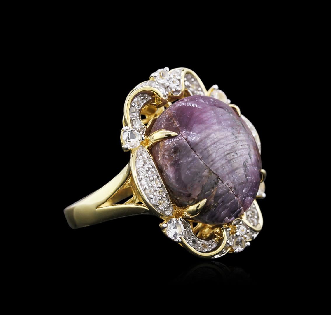 One electronically tested 925 silver ladies cast star ruby and white sapphire ring. The ring features a cabochon star ruby set within a multi-tiered (Victorian Period inspired) white sapphire bezel, supported by an elaborate concave under gallery and tapering shoulders, completed by a two and one half millimeter wide band. Bright polish finish with a yellow gold overlay. Trademark is Orianne. Identified with markings of "925". Condition is new, good workmanship. Containing: One prong set oval cabochon cut natural star ruby, measuring 17.00 x 15.60mm, approximate weight of 30.91ct., clarity is severely included, dark, very slightly brownish, strongly purplish red color, (GIA stpR 7/3), cut is good. This stone has a mostly complete six ray star with medium intensity and good movement. Transmitting light very diffusely, opaque. Naturally occurring internal & external characteristics are present. No indications (NTE) of heating. Graded in the setting. Forty-eight prong set round brilliant cut natural white sapphires, measuring 2.70 - 1.20mm, approximate total weight of 1.05ct., clarity is eye clean, medium light, slightly grayish, white color, (GIA W 4/2), cut is good. Graded in the setting. Total Weight of Colored Stones: 31.96 ct. Total Weight of Ring: 12.84 gm. AIG Appraised at $3,750.00.