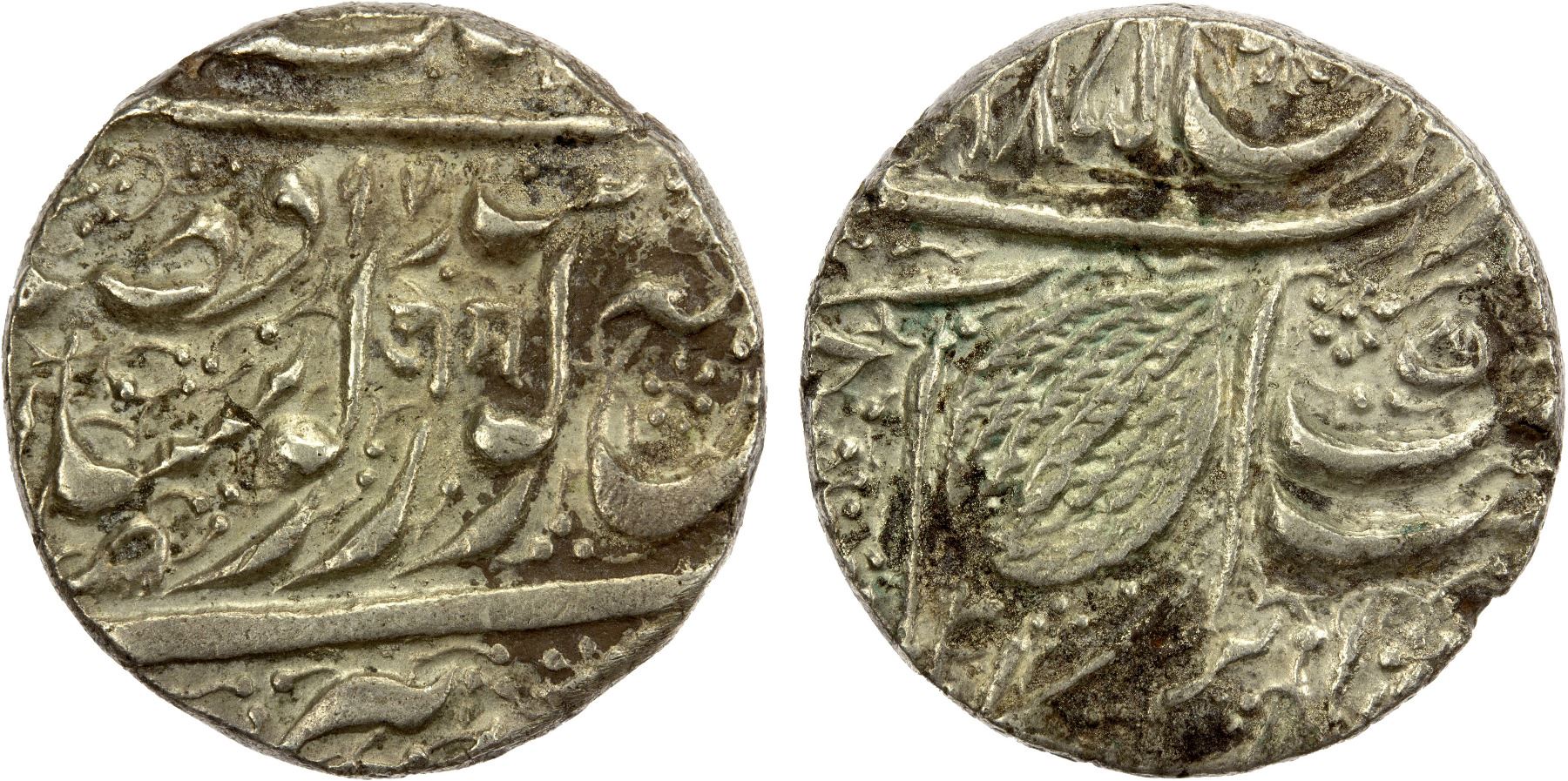 SIKH EMPIRE: AR nanakshahi rupee (11.10g), Amritsar, VS[18]97, Herrli-01.11.04, KM-22.4., VS1885 series, with Nagari OM in the obverse center, rare one-year type, some light adhesions, mostly on the edge, nearly EF.