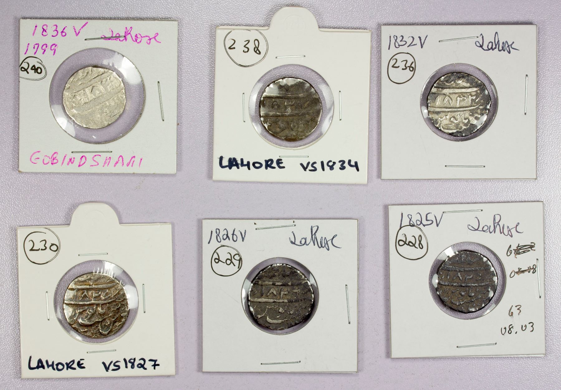 SIKH EMPIRE: LOT of 6 silver rupees, Lahore Mint, early dates, KM-63 (Herrli-08.03.04): VS1825 (Fine, encrusted), 1826 (VF, encrusted), 1827 (VF, some light corrosion on obverse), 1832 (bold VF, some light hornsilver at the rims), 1834 (VG, encrusted), and 1836 (VG-F); retail value $350, lot of 6 pieces, ex Butalia Collection.