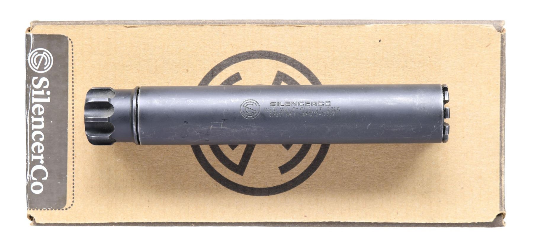 Cal.22. S# SPCT2-17727. A small, lightweight, stainless steel sound suppressor w/ multicaliber functionality. At an overall length of just over 6" w/ an outside diameter of only 1", it offers great performance in a small package. It is manufactured from 316 SS & 17–4 SS & rated for use w/ .22LR, 17HMR & 5.7x28MM. Matte black finish. UNATTACHED ACCESSORIES: Factory box, disassembly tool & paperwork.. CONDITION: Finish coverage complete & consistent, showing drag lines typical of normal use. NATIONAL FIREARMS ACT SOUND SUPPRESSOR REQUIRING BATF TRANSFER BEFORE TAKING POSSESSION. FULLY TRANSFERABLE.(03-1846/JZ). MODERN CLASS III. $200-300.