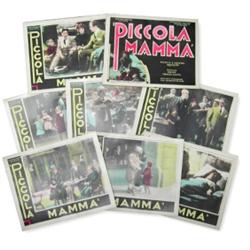 <b>1374. SILENT FILM LOBBY CARDS </b>Very rare set of eight color lobby cards promoting the Marconi Film Co. release "<i>Piccola Mamma</i>" ["The Little Mother"], an Italian silent film issued in 1914. Each lobby card shows a scene from the film and credits the Marconi Film Co. as producer. Inventor Guglielmo Marconi entered the motion picture business through the encouragement of his friend and fellow inventor Thomas Edison, who was already well-established in the industry. Despite Marconi's best efforts, his venture nearly led to his personal bankruptcy! The cards are in very good to fine condition, with the torn original sleeve.<b>$200-300</b>