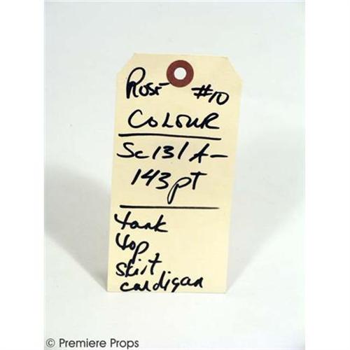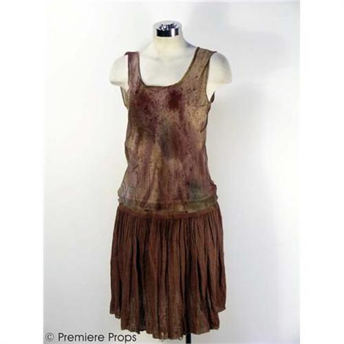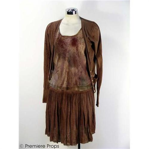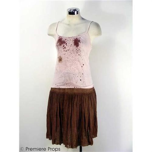 SILENT HILL - Did Rose barely survive her trip to Silent Hill? Pick up this great testament to her struggle! Hero Blood Soaked Costume: Bloody Cardigan Sweater (no size indicated / two pockets / button up front / features fake blood stains and splatters throughout), Bloody Chiffon Top (no size indicated / features fake blood stains throughout), Blood Stained Tank Top (no size indicated / white top tinted pink from fake blood stains / features fake blood splatters throughout), Bloody Ruffle Skirt (no size indicated / zip up sides / elastic waistband / features fake blood stains) (entire costume severely aged and distressed by studio / includes costume department wardrobe tag / screenworn towards movie's finale). (SHL1044)
