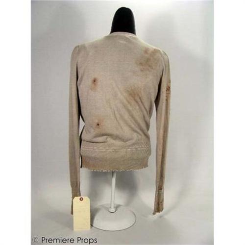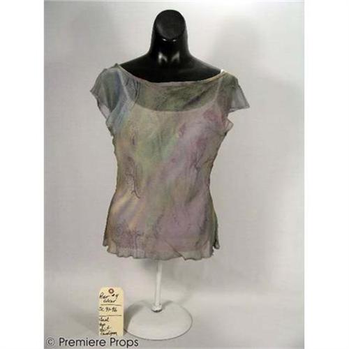 SILENT HILL - This is a must have for fans of SIlent Hill. It is a complete costume worn on-screen by Rose (Radha Mitchell). The collection includes a tattered "Club Monaco" L/S cardigan with two hip pockets, elastic waistbands and cuffs, and covered with bloodstains on both the front and back. The bottom button is missing. Also included is a sullied short-sleeve pastel (purple, green and pink) colored blouse made of sheer fabric and featuring a low-cut neck, a cream “Gap” spaghetti strap tank top, and a bloody dark-green pleated skirt. Wardrobe tag is included. Revisit Silent Hill with a remarkable costume taken from the set of the film.(SHL1013)