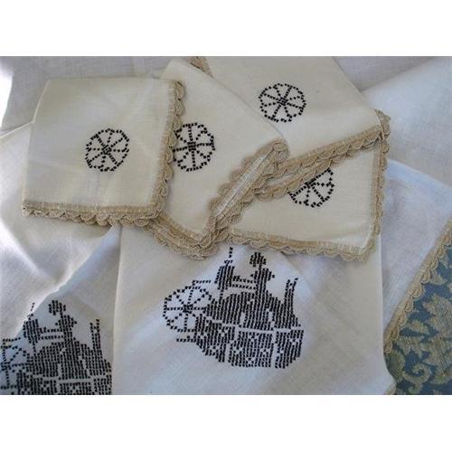LOVELY VINTAGE LINEN TABLECLOTH, UNIQUE SILHOUETTE EMBROIDERY IN BLACK CROSS STITCH DEPICTING VICTORIAN LADY AT WORK, as per images Tablecloth and serviettes(serviettes looks like never used), seem to be in Excellent condition - Tablecloth measures about 36" x 36" and each serviette about 11 1/2" x 11 1/2",US Buyer to pay 7.00 for shipping plus insurance.THANKS.