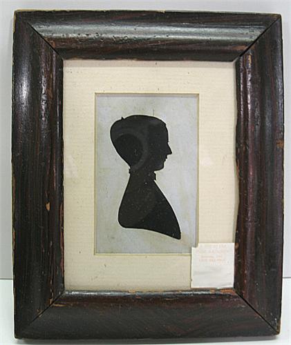 SILHOUETTE OF FEMALE IN PRIMITIVE FRAME. Circa 1830. Frame shows some signs of wear. Shingle back. 6.25" X 7.75" framed.