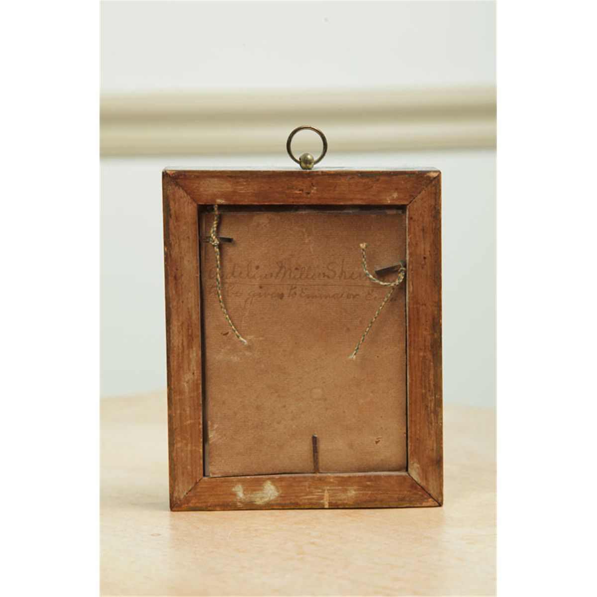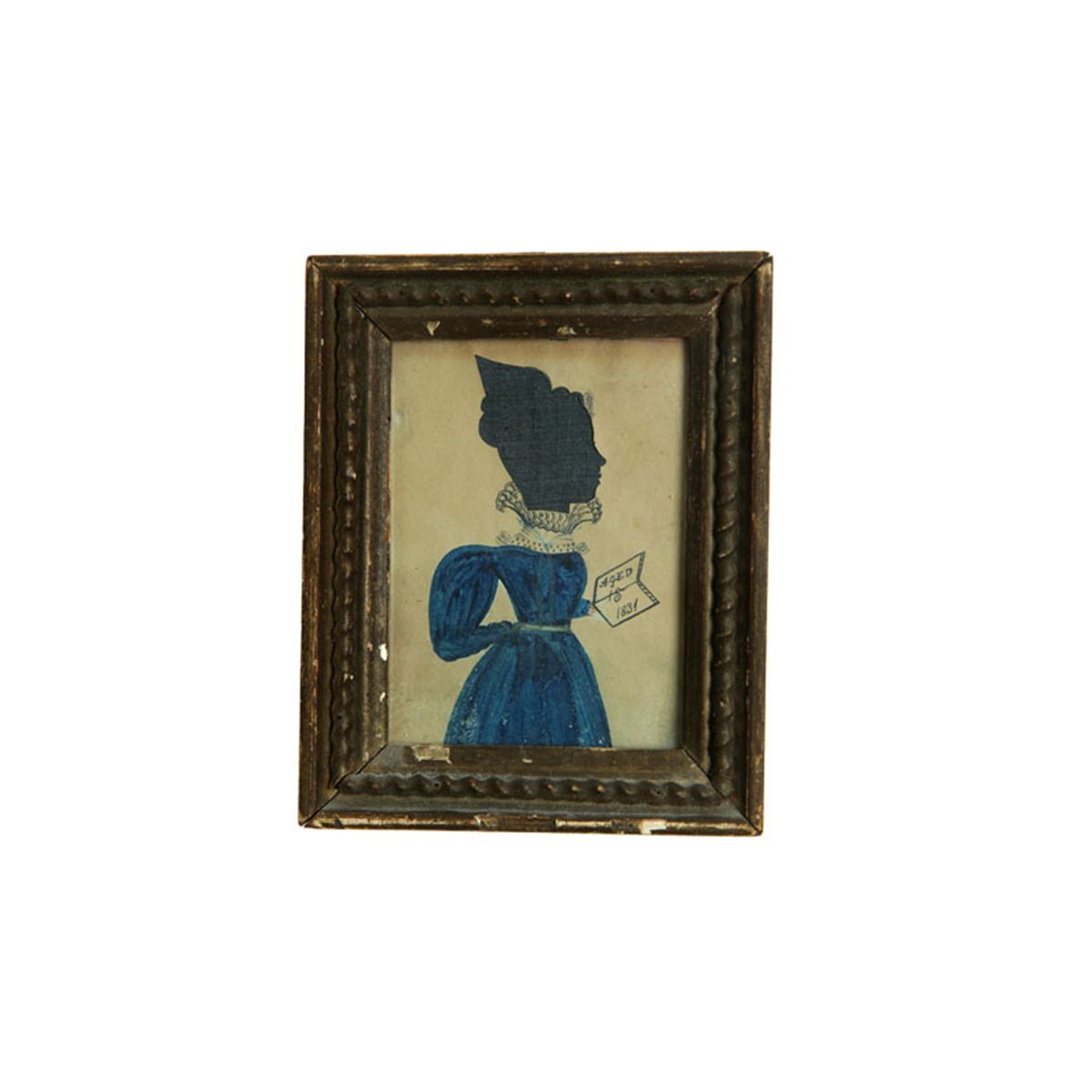 Attributed to the Puffy Sleeve Artist, New England, active 1830s. Three-quarter length image, hollow cut with a blue dress, brooch and collar in watercolor. Notation "Aged 15 1831" and on the back "Adelin/Adelia Miller Sherman to be given to Emma" (?). Period frame. 5 1/4"h. 4 1/4"w. Ex David Good (Ohio).