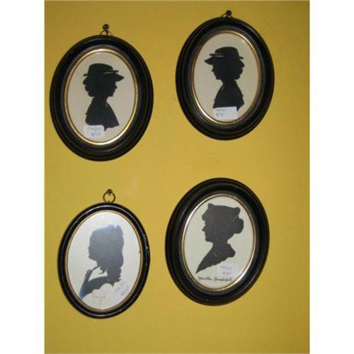 A LOVELY SET OF 4 SILOUETTES - 3 WITH MATCHING OVAL FRAMES AND ONE WITH A SLIGHTLY DIFFERENT OVAL FRAME WITH A LITTLE GIRL WHICH IS $125. THE SILHOUETTES OF THE WOMEN CAN BE PURCHASED SEPERATELY FOR $95. EACH. THE FRAMES OF THESE ALL APPEAR TO BE THE ORIGINALS. TWO OF THEM LOOK LIKE A MIRRORED VERSION OF THE SAME PERSON.