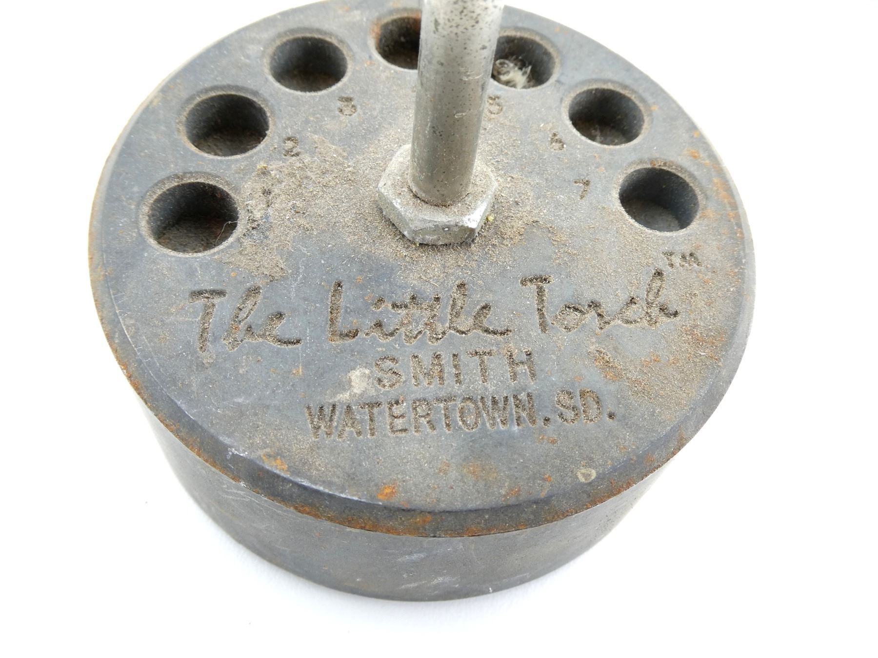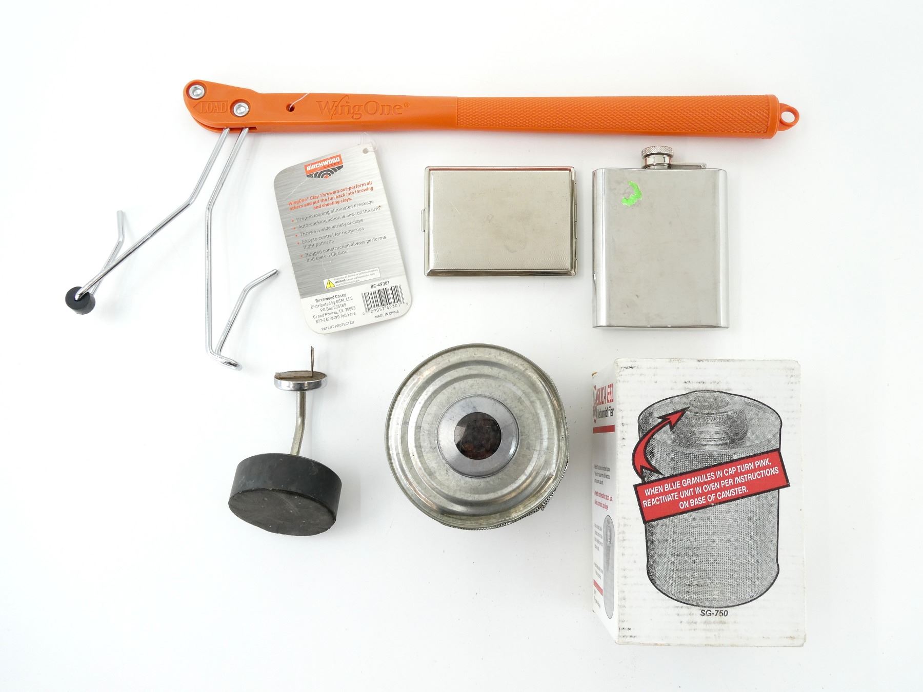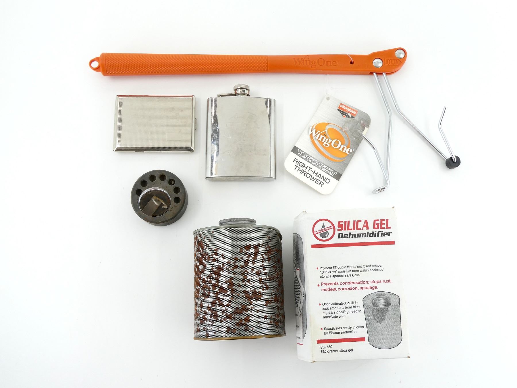 LOT INCLUDES; (1) HYDROSORBENT SILICA GEL DEHUMIDIFIER, PROTECTS 57 CUBIC FEET / 1614 LITRES, INSTRUCTIONS PRINTED ON BOTTOM OF CANISTER, SOME RUST, WITH ORIGINAL PACKAGING, (1) BIRCHWOOD CASEY WING ONE HAND-HELD CLAY TARGET THROWER, RIGHT-HANDED, VARIOUS MARKINGS, TAG STILL ATTACHED, OAL APPROX. 22 3/8", (1) STAINLESS STEEL 7 OZ FLASK, VARIOUS MARKINGS / ETCHINGS, TWIST ON CAP, (1) STEEL CIGARETTE HOLDER, MARKED: "GERMANY", APPROX. 4 3/8" X 3 1/8" & (1) ANTIQUE TORCH HOLDER, MARKED: "THE LITTLE TORCH, SMITH, WATERTOWN. SD.". SEE PHOTOS.