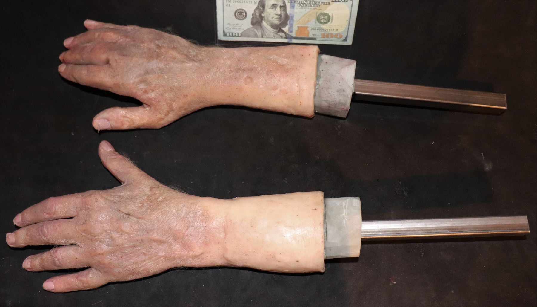 These are arguably the finest matched set of silicone hands I have ever offered. Already on rods to put on a mannequin.
