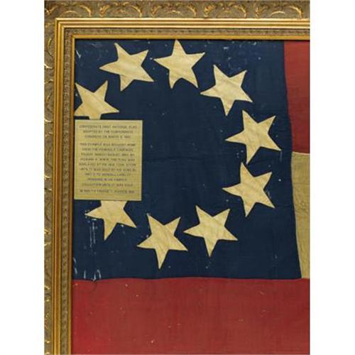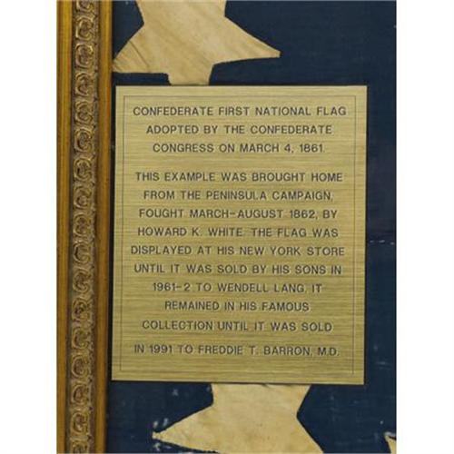 <B>BEAUTIFUL CONFEDERATE 10 STAR 1ST NATIONAL FLAG WITH CAPTURE HISTORY.</B></I> All silk construction, 33” on the hoist, 60” on the fly, entirely hand stitched . 4 ½” stars of white cotton, double sided. The top two stripes are one piece, the bottom red stripe is constructed of two pieces. The flag has been archivally framed and includes a brass plaque detailing the flag’s history. This wonderful Confederate flag was captured during the Peninsula Campaign, March - August 1862, by Howard K. White. After the war the flag was displayed in Mr. White’s well known retail establishment in New York City until 1961 when it was acquired by renowned collector Wendell Lang from Mr. White’s sons. The flag remained in Mr. Lang’s possession until 1991 when ownership transferred to Dr. Freddie T. Barron. A superb Confederate 1st national, visually striking for its size, bright color and great character. Includes a wonderful history of lineage from its capture to the present day.<BR><B><BR>Provenance:</B></I><I>Captured August 1862 by HK White, sold by his descendants in 1961; Lang and Barron Collections. </B></I><B><BR><BR>Condition: </B></I>The flag is very sound. A number of scattered small holes, the largest being ½” X 2” in the center of the white stripe. The white stripe and cotton stars have darkened a bit with age. Overall the flag is in very fine untouched condition.<BR><BR>This flag has been carefully examined by authoritative in-house experts and has been deemed to be authentic and of the period in every respect including fabric, thread, dye and the method and pattern of construction. Additionally, any accompanying provenance has been verified as unique and indigenous to the specific flag it documents.<BR><BR><b>Shipping:</b> Framed - with Glass, Large (<a target="_blank" href="http://www.heritageauctions.com/common/shipping.php">view shipping information</a>)