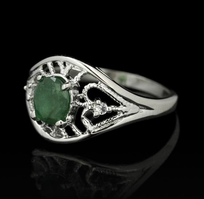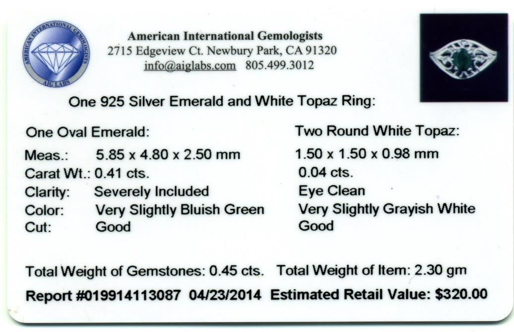 One electronically tested 925 silver ladies cast emerald and white topaz ring with a bright polish finish. The featured emerald is set within a lattice gallery, accented with white topaz, completed by a one and one-half millimeter wide band. Identified with markings of "925". Condition is new, good workmanship. Containing: One prong set oval mixed cut natural emerald, measuring 5.85 x 4.80 x 2.50mm, 6% bulge factor, approximate weight of 0.41ct, clarity is severely included, type III, medium dark, very slightly grayish, very slightly bluish green color, (GIA vslbG 6/3), cut is good. Transmitting light somewhat diffusely, translucent. Naturally occurring internal & external characteristics are present. Indications of oil residue. Graded in the setting. Two prong set round brilliant cut natural white topazes, measuring 1.50 - 1.50 x 0.98 mm, approximate total weight of 0.04ct, clarity is eye clean, colorless, very slightly grayish, white color, (GIA W 0/3), cut is good. Transmitting light with no distortion, transparent. Color grade is an average for the group. Graded in the setting. Total Weight of Colored Stones 0.45 ct. Total Weight of Ring 2.30 grams AIG Appraised at $320.00.