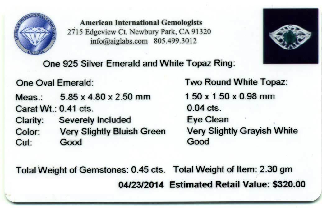 One electronically tested 925 silver ladies cast emerald and white topaz ring with a bright polish finish. The featured emerald is set within a lattice gallery, accented with white topaz, completed by a one and one-half millimeter wide band. Identified with markings of "925". Condition is new, good workmanship. Containing: One prong set oval mixed cut natural emerald, measuring 5.85 x 4.80 x 2.50mm, 6% bulge factor, approximate weight of 0.41ct, clarity is severely included, type III, medium dark, very slightly grayish, very slightly bluish green color, (GIA vslbG 6/3), cut is good. Transmitting light somewhat diffusely, translucent. Naturally occurring internal & external characteristics are present. Indications of oil residue. Graded in the setting. Two prong set round brilliant cut natural white topazes, measuring 1.50 - 1.50 x 0.98 mm, approximate total weight of 0.04ct, clarity is eye clean, colorless, very slightly grayish, white color, (GIA W 0/3), cut is good. Transmitting light with no distortion, transparent. Color grade is an average for the group. Graded in the setting. Total Weight of Colored Stones 0.45 ct. Total Weight of Ring 2.30 grams AIG Appraised at $320.00.