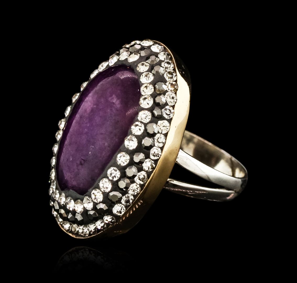 One electronically tested 925 silver ladies custom cast & assembled ring. The featured quench cracked quartz is set within tiered cubic zirconia bezels, completed by a three and one-half millimeter wide band. Bright and anodized finish. Identified with markings of "925". Condition is new, good workmanship. Containing: One bezel set oval cabochon cut quench crackled quartz, measuring 17.00 x 11.50 x 3.50mm, approximate weight of 4.91ct., clarity is severely included, dark, very slightly grayish, purple red color, (GIA PR 7/3), cut is good. One hundred four round mixed cut laboratory created black and white foil backs, measuring 1.90 - 1.70 x 1.17 mm, approximate total weight of 5.20ct., clarity is eye clean, cut is good. Total Weight of Colored Stones 10.11ct. Total Weight of Ring 10.29 grams. AIG Appraised at $1,000.00.