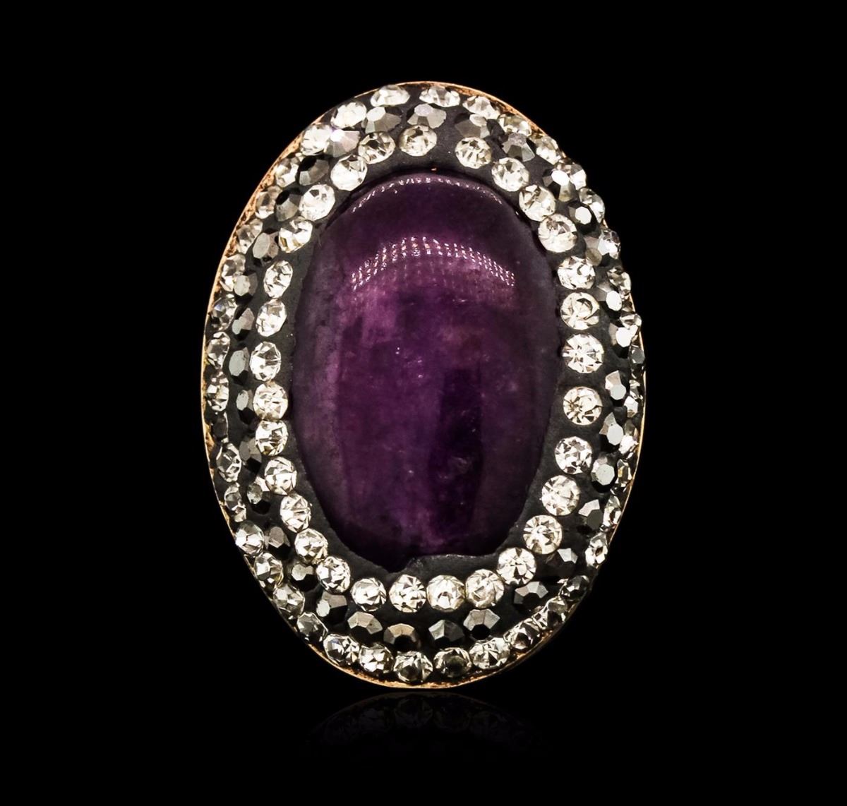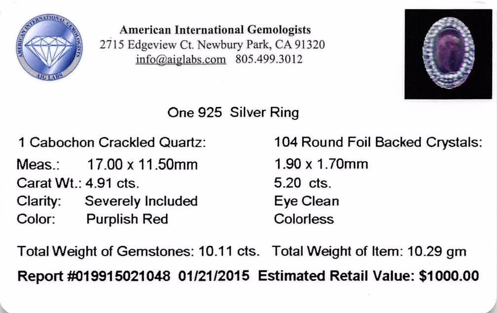 One electronically tested 925 silver ladies custom cast & assembled ring. The featured quench cracked quartz is set within tiered cubic zirconia bezels, completed by a three and one-half millimeter wide band. Bright and anodized finish. Identified with markings of "925". Condition is new, good workmanship. Containing: One bezel set oval cabochon cut quench crackled quartz, measuring 17.00 x 11.50 x 3.50mm, approximate weight of 4.91ct., clarity is severely included, dark, very slightly grayish, purple red color, (GIA PR 7/3), cut is good. One hundred four round mixed cut laboratory created black and white foil backs, measuring 1.90 - 1.70 x 1.17 mm, approximate total weight of 5.20ct., clarity is eye clean, cut is good. Total Weight of Colored Stones 10.11ct. Total Weight of Ring 10.29 grams. AIG Appraised at $1,000.00.