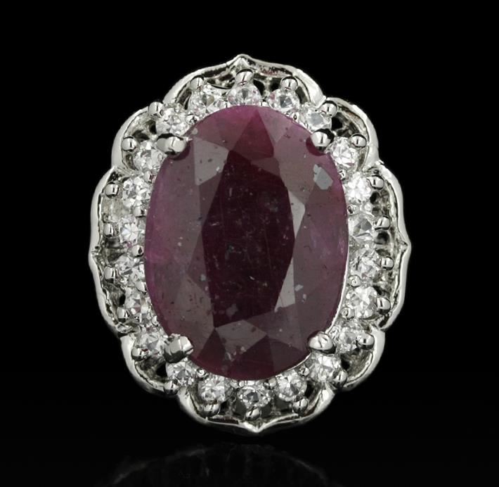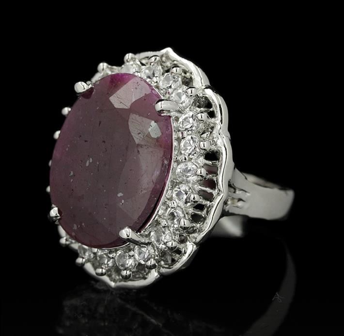 One electronically tested 925 silver ladies cast dyed corundum and white topaz ring with a bright polish finish. The featured dyed corundum is set within a white topaz floret bezel supported by tapering shoulders, completed by a two and one-half millimeter wide band. Identified with markings of "925". Condition is new, good workmanship. Containing: One prong set oval mixed cut natural dyed corundum, measuring 17.50 x 13.20 x 6.25mm, 8% bulge factor, approximate weight of 12.72ct, clarity is severely included, dark, very slightly brownish, slightly purplish red color, (GIA slpR 7/3), cut is good. Transmitting light very diffusely, translucent and opaque. Naturally occurring internal & external characteristics are present. Indications of multiple laboratory enhancements, including dye. The presence of dye prevents determining whether this stone would have sufficient depth of color to be considered Ruby. Graded in the setting. Twenty-two prong set round mixed cut natural white topazes, measuring 2.20 - 2.20 x 1.43 mm, approximate total weight of 1.10ct, clarity is eye clean, colorless, very slightly grayish, white color, (GIA W 0/3), cut is good. Transmitting light with no distortion, transparent. Color grade is an average for the group. Graded in the setting. Total Weight of Colored Stones 13.82 ct. Total Weight of Ring 9.00 grams AIG Appraised at $705.00.