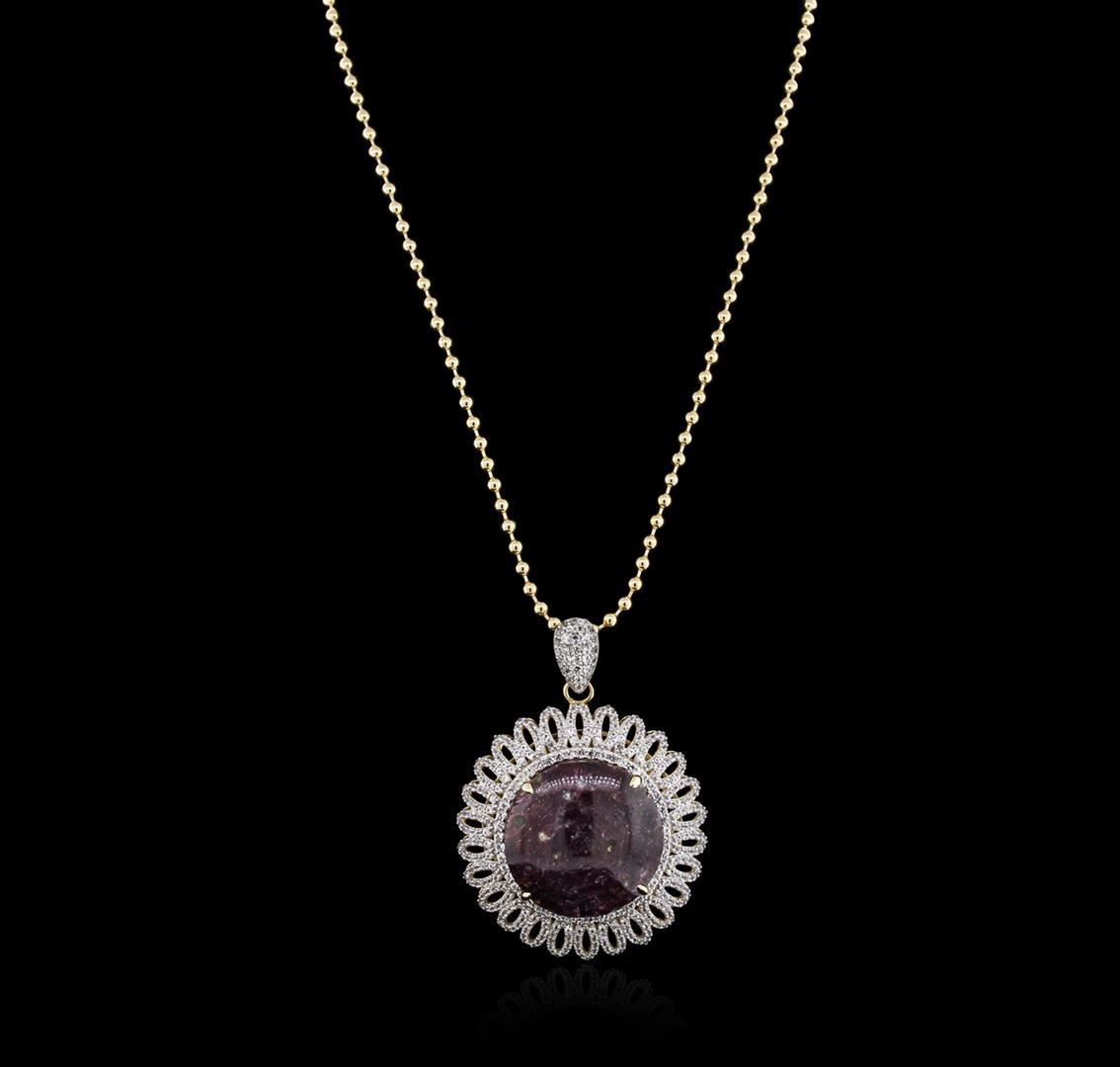 One electronically tested 925 silver ladies cast & assembled star ruby and white sapphire pendant with chain. The pendant features a star ruby set within a stylized white sapphire lattice gallery, completed by a white sapphire set bail. The pendant is supported by an eighteen inch length 925 silver designer style chain, terminating in a spring ring clasp. Bright polish finish with a yellow gold overlay and rhodium accents. Trademark is Orianne. Identified with markings of "925". Condition is new, good workmanship. Containing: One prong set oval cabochon cut natural star ruby, measuring 28.50 x 28.00 x 15.20mm, approximate weight of 126.02ct., clarity is severely included, dark, very slightly brownish, slightly purplish red color, (GIA slpR 7/3), cut is good. This stone has an incomplete six ray star with weak intensity and good movement. Transmitting light very diffusely, opaque. Naturally occurring internal & external characteristics are present. No indications of heating (NTE). Graded in the setting. Ruby has a low tolerance to rhodium plating, repolishing the surface, & ultrasonic cleaning. Three hundred sixty-five prong set round mixed cut natural white sapphires, measuring 1.70 - 1.40 x 1.01mm, approximate total weight of 7.32ct., clarity is eye clean, colorless, very slightly grayish, white color, (GIA W 0/3), cut is good. Transmitting light with no distortion, transparent. Color grade is an average for the group. Graded in the setting. Total Weight of Colored Stones: 133.34 ct. Total Weight of Pendant with Chain: 49.24 gm. AIG Appraised at $15,370.00.