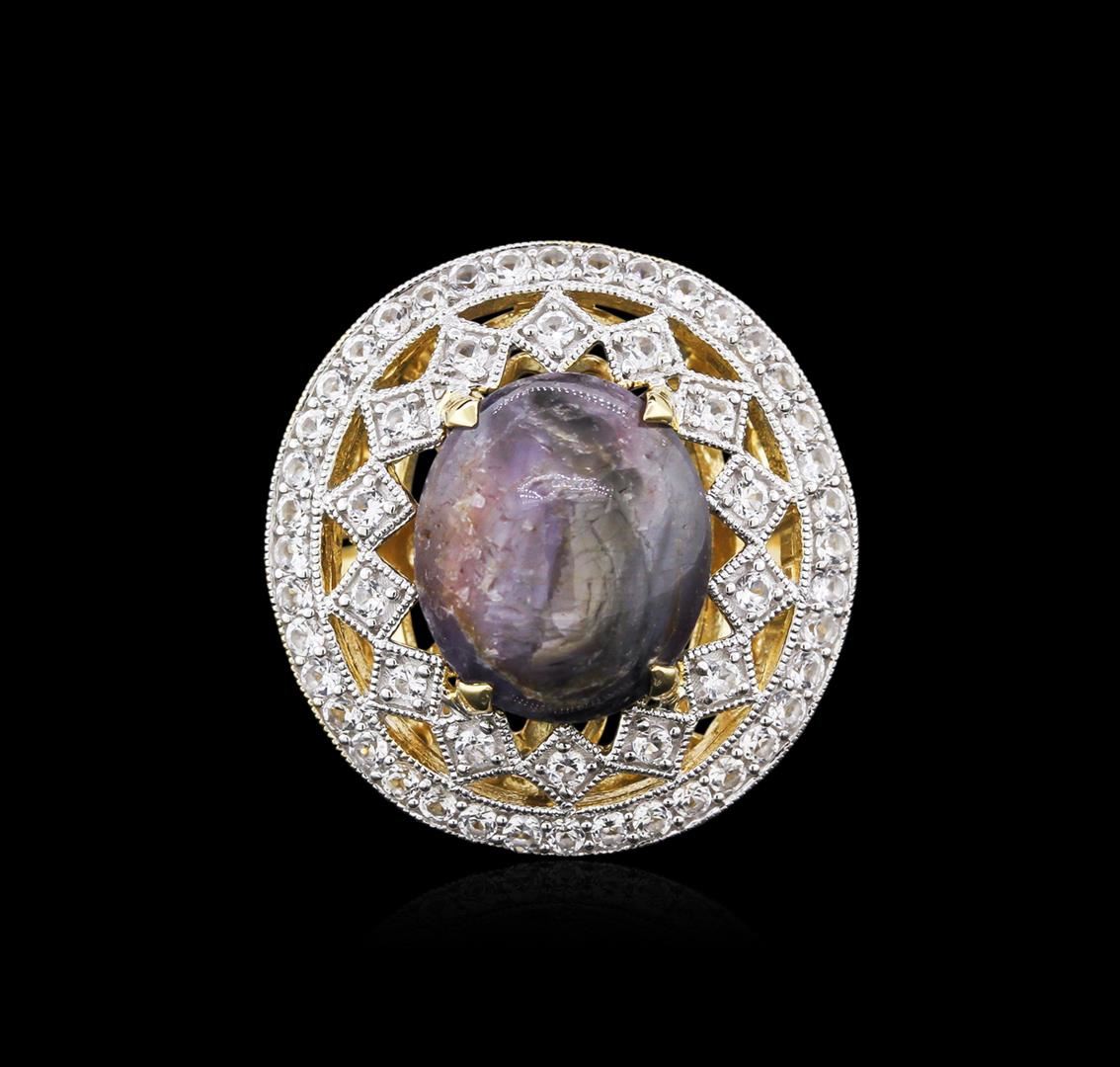 One electronically tested 925 silver ladies cast star ruby and white sapphire ring. Condition is new, good workmanship. The featured star ruby is set within an elaborate white sapphire lattice gallery, completed by a two and one-half millimeter wide band. Bright polish finish with a yellow gold overlay and milgrain detailing throughout. Trademark is Orianne. Identified with markings of "925". Containing: One prong set oval cabochon cut natural star ruby, measuring 13.00 x 11.00 x 7.40mm, 15% bulge factor, approximate weight of 13.24ct., clarity is severely included, dark, slightly brownish, strongly purplish red color, (GIA stpR 7/2), cut is good. This stone has a incomplete six ray star with weak intensity and good movement. Transmitting light very diffusely, opaque. Naturally occurring internal & external characteristics are present. No indications of heating. Graded in the setting. Ruby has a low tolerance to rhodium plating, repolishing the surface, & ultrasonic cleaning. Fifty-four prong set round mixed cut natural white sapphires, measuring 1.60 - 1.30 x 0.94 mm, approximate total weight of 1.12ct., clarity is eye clean, colorless, very slightly grayish, white color, (GIA W 0/3), cut is good. Transmitting light with no distortion, transparent. Color grade is an average for the group. Graded in the setting. Total Weight of Colored Stones: 14.36 ct. Total Weight of Ring: 9.01 gm. AIG Appraised at $1,870.00.