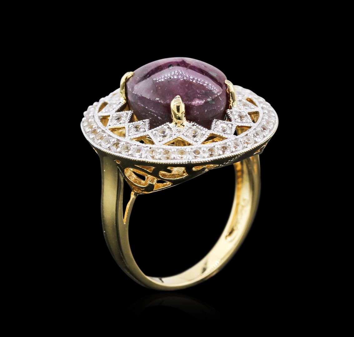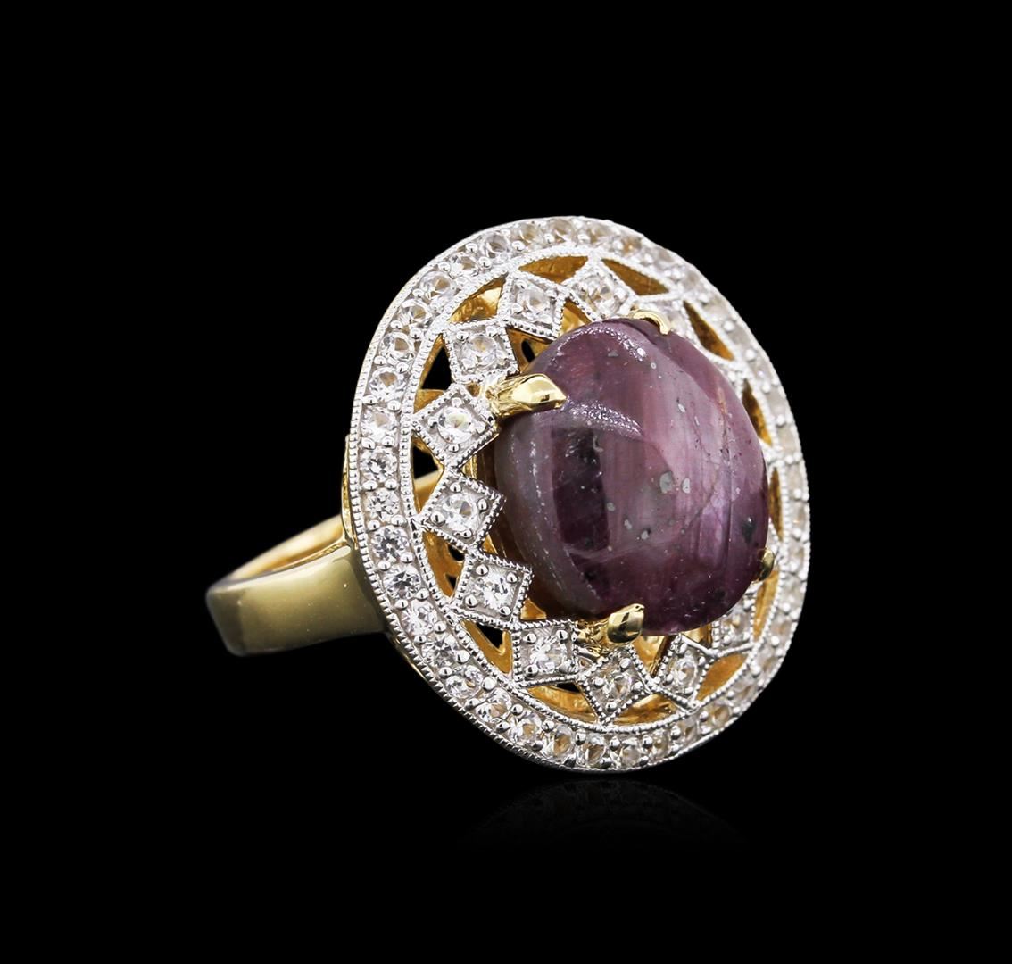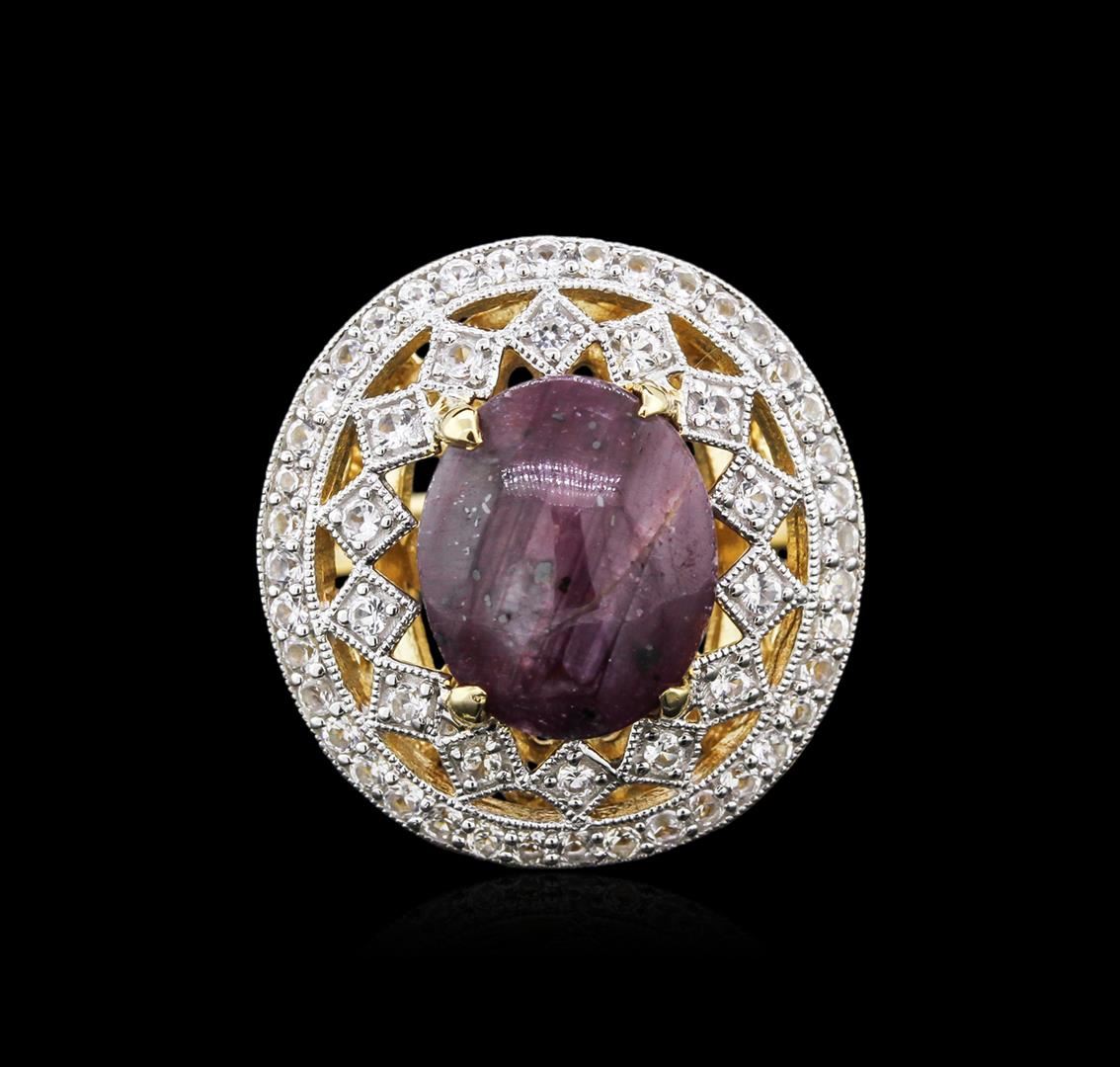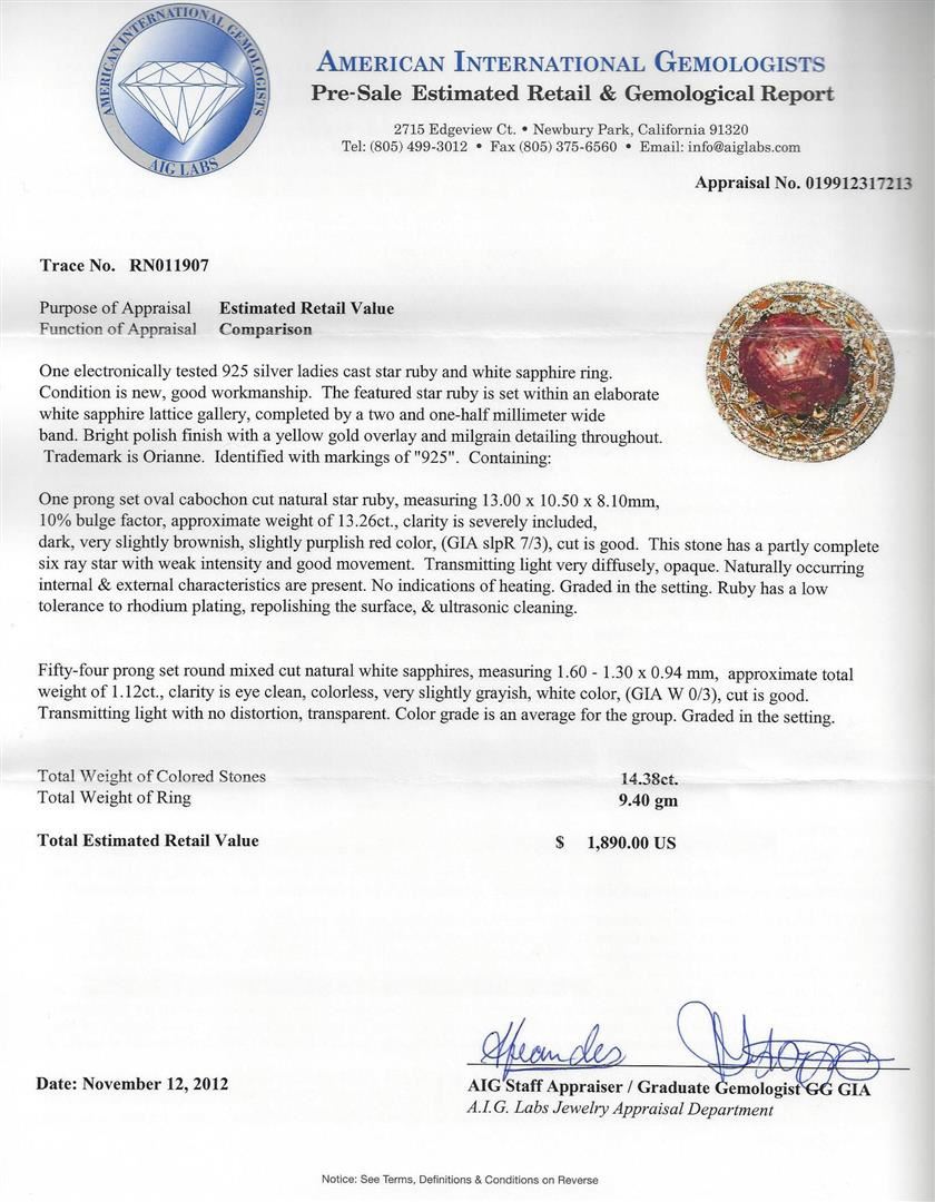 One electronically tested 925 silver ladies cast star ruby and white sapphire ring. Condition is new, good workmanship. The featured star ruby is set within an elaborate white sapphire lattice gallery, completed by a two and one-half millimeter wide band. Bright polish finish with a yellow gold overlay and milgrain detailing throughout. Trademark is Orianne. Identified with markings of "925". Containing: One prong set oval cabochon cut natural star ruby, measuring 13.00 x 10.50 x 8.10mm, 10% bulge factor, approximate weight of 13.26ct., clarity is severely included, dark, very slightly brownish, slightly purplish red color, (GIA stpR 7/3), cut is good. This stone has a partly complete six ray star with weak intensity and good movement. Transmitting light very diffusely, opaque. Naturally occurring internal & external characteristics are present. No indications of heating. Graded in the setting. Ruby has a low tolerance to rhodium plating, repolishing the surface, & ultrasonic cleaning. Fifty-four prong set round mixed cut natural white sapphires, measuring 1.60 - 1.30 x 0.94 mm, approximate total weight of 1.12ct., clarity is eye clean, colorless, very slightly grayish, white color, (GIA W 0/3), cut is good. Transmitting light with no distortion, transparent. Color grade are an average for the group. Graded in the setting. Total Weight of Colored Stones: 14.38 ct. Total Weight of Ring: 9.40 gm. AIG Appraised at $1,890.00.