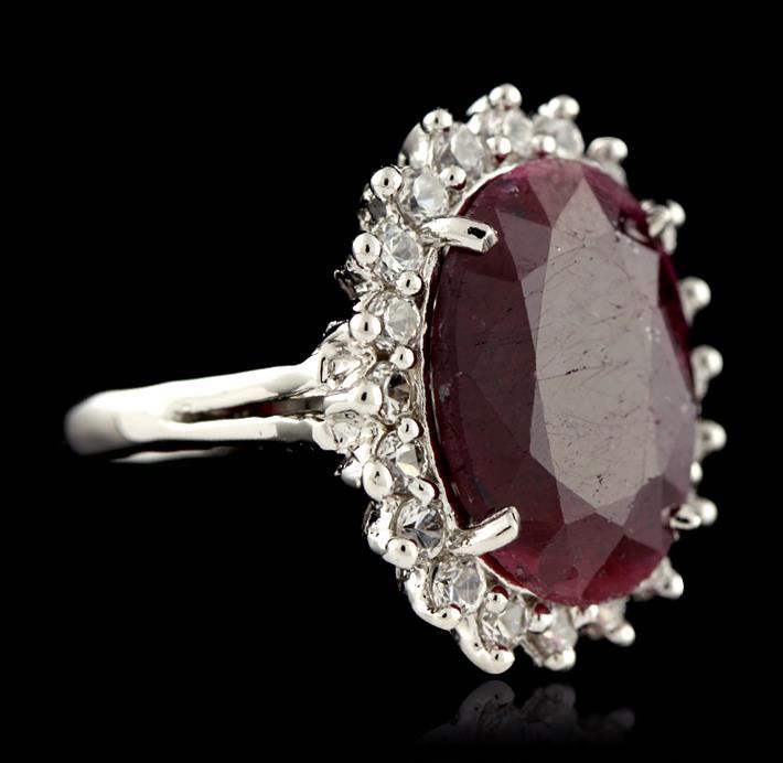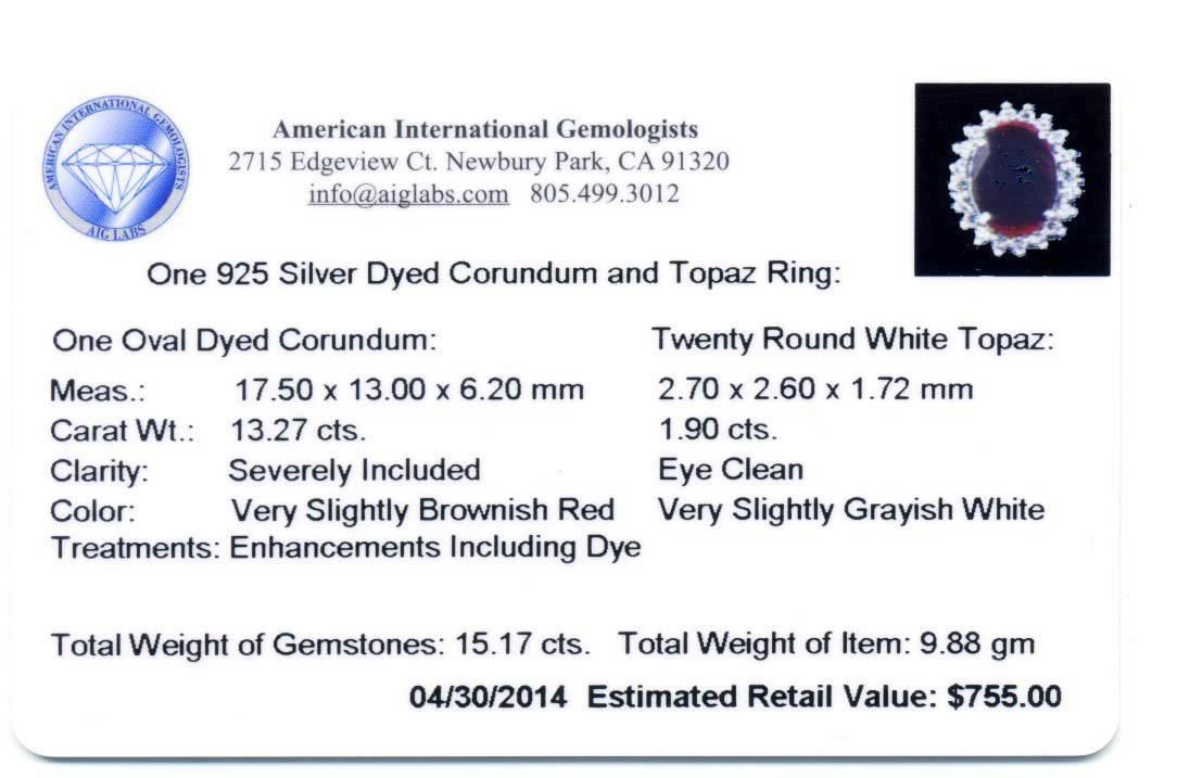 One electronically tested 925 ladies cast dyed corundum and white topaz ring with a bright polish finish. The featured dyed corundum is set within a white topaz ring supported by split shoulders, completed by a two and one-half millimeter wide band. Identified with markings of "925". Condition is new, good workmanship. Containing: One prong set oval mixed cut natural dyed corundum, measuring 17.50 x 13.00 x 6.20mm, 15% bulge factor, approximate weight of 13.27ct, clarity is severely included, dark, very slightly brownish, red color, (GIA R 7/3), cut is good. Transmitting light diffusely, translucent to opaque. Naturally occurring internal & external characteristics are present. Indications of multiple laboratory enhancements, including dye. The presence of dye prevents determining whether or not this stone would have sufficient depth of color to be considered ruby. Graded in the setting. Twenty prong set round brilliant cut natural white topazes, measuring 2.70 - 2.60 x 1.72 mm, approximate total weight of 1.90ct, clarity is eye clean, colorless, very slightly grayish, white color, (GIA W 0/3), cut is good. Transmitting light with no distortion, transparent. Color grade is an average for the group. Graded in the setting. Total Weight of Colored Stones 15.17 ct. Total Weight of Ring 9.88 grams AIG Appraised at $755.00.