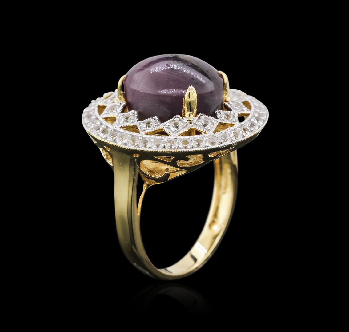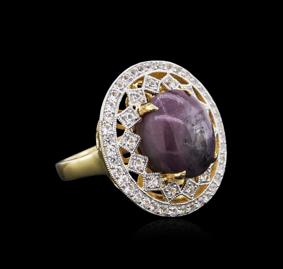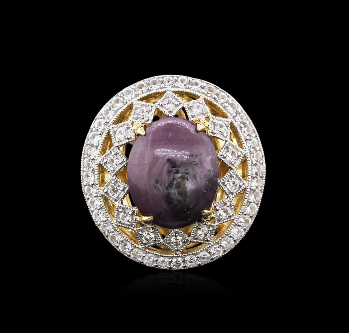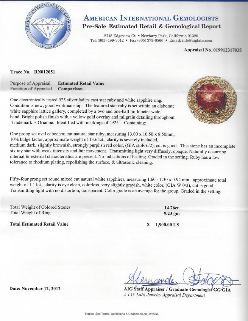 One electronically tested 925 silver ladies cast star ruby and white sapphire ring. Condition is new, good workmanship. The featured star ruby is set within an elaborate white sapphire lattice gallery, completed by a two and one-half millimeter wide band. Bright polish finish with a yellow gold overlay and milgrain detailing throughout. Trademark is Orianne. Identified with markings of "925". Containing: One prong set oval cabochon cut natural star ruby, measuring 13.50 x 10.50 x 8.50mm, 10% bulge factor, approximate weight of 13.65ct., clarity is severely included, medium dark, slightly brownish, strongly purplish red color, (GIA stpR 6/2), cut is good. This stone has a incomplete six ray star with weak intensity and fair movement. Transmitting light very diffusely, opaque. Naturally occurring internal & external characteristics are present. No indications of heating. Graded in the setting. Ruby has a low tolerance to rhodium plating, repolishing the surface, & ultrasonic cleaning. Fifty-four prong set round mixed cut natural white sapphires, measuring 1.60 - 1.30 x 0.94 mm, approximate total weight of 1.11ct., clarity is eye clean, colorless, very slightly grayish, white color, (GIA W 0/3), cut is good. Transmitting light with no distortion, transparent. Color grade is an average for the group. Graded in the setting. Total Weight of Colored Stones: 14.76 ct. Total Weight of Ring: 9.23 gm. AIG Appraised at $1,900.00.