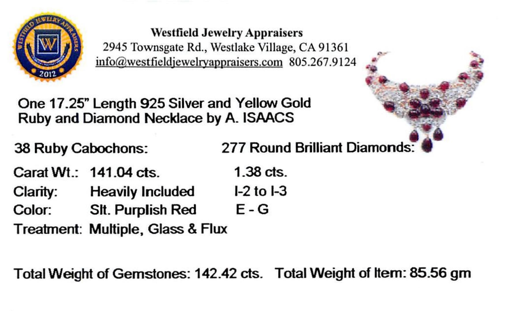 One-quarter inch length necklace features a ruby and diamond lattice design with three ruby dangles supported by stylized ruby and diamond links. terminating in a diamond accented box clasp with twin safeties. Bright polish finish with milgrain detailing and yellow gold overlay. Trademark is A. ISAACS. Identified with markings of "925". Condition is new, good workmanship. Containing: Thirty-eight prong set oval and pear cabochon cut natural rubies approximate total weight of 141.04ct., clarity is heavily included, type II, medium dark, very slightly brownish, slightly purplish red color, (GIA slpR 6/3), cut is good. Transmitting light somewhat diffusely, transparent to translucent. Naturally occurring internal & external characteristics are present. Color grade is an average for the group. Indications of laboratory high temperature heat treatment, with glass & flux additives. Graded in the setting. Ruby has a low tolerance to rhodium plating, repolishing the surface, & ultrasonic cleaning. Two Hundred Seventy-Seven prong set round brilliant cut diamonds approximate total weight of 277 Stones = 1.38ct. Graded in the setting. Clarity: I-2 to I-3. Color: E - G. Total Weight of Colored Stones141.04ct. Total Weight of Diamonds 1.38ct. Total Weight of Necklace 85.56gm. AIG Appraised.