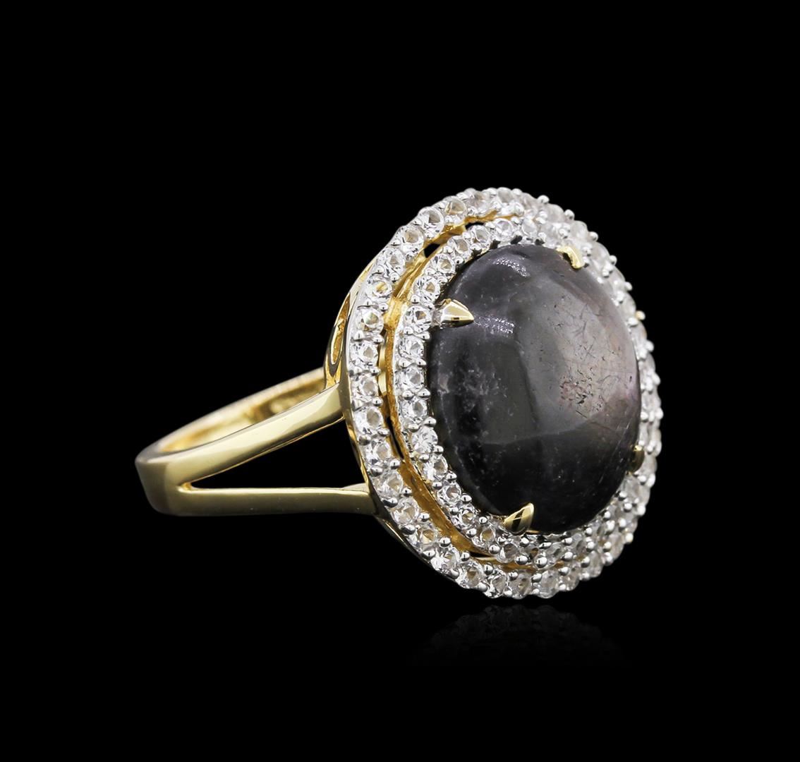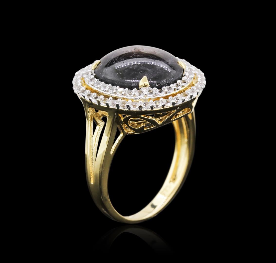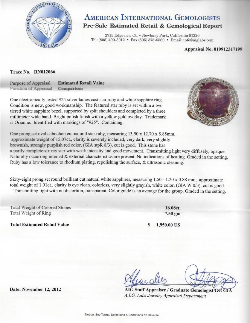 One electronically tested 925 silver ladies cast star ruby and white sapphire ring. Condition is new, good workmanship. The featured star ruby is set within a two tiered white sapphire bezel, supported by split shoulders and completed by a three millimeter wide band. Bright polish finish with a yellow gold overlay. Trademark is Orianne. Identified with markings of "925". Containing: One prong set oval cabochon cut natural star ruby, measuring 13.90 x 12.70 x 5.85mm, approximate weight of 15.07ct., clarity is severely included, very dark, very slightly brownish, strongly purplish red color, (GIA stpR 8/3), cut is good. This stone has a partly complete six ray star with weak intensity and good movement. Transmitting light very diffusely, opaque. Naturally occurring internal & external characteristics are present. No indications of heating. Graded in the setting. Ruby has a low tolerance to rhodium plating, repolishing the surface, & ultrasonic cleaning. Sixty-eight prong set round brilliant cut natural white sapphires, measuring 1.50 - 1.20 x 0.88 mm, approximate total weight of 1.01ct., clarity is eye clean, colorless, very slightly grayish, white color, (GIA W 0/3), cut is good. Transmitting light with no distortion, transparent. Color grade are an average for the group. Graded in the setting. Total Weight of Colored Stones: 16.08 ct. Total Weight of Ring: 7.50 gm. AIG Appraised at $1,950.00.