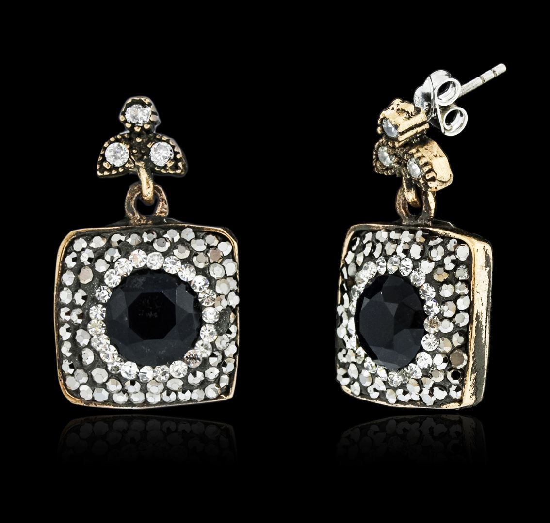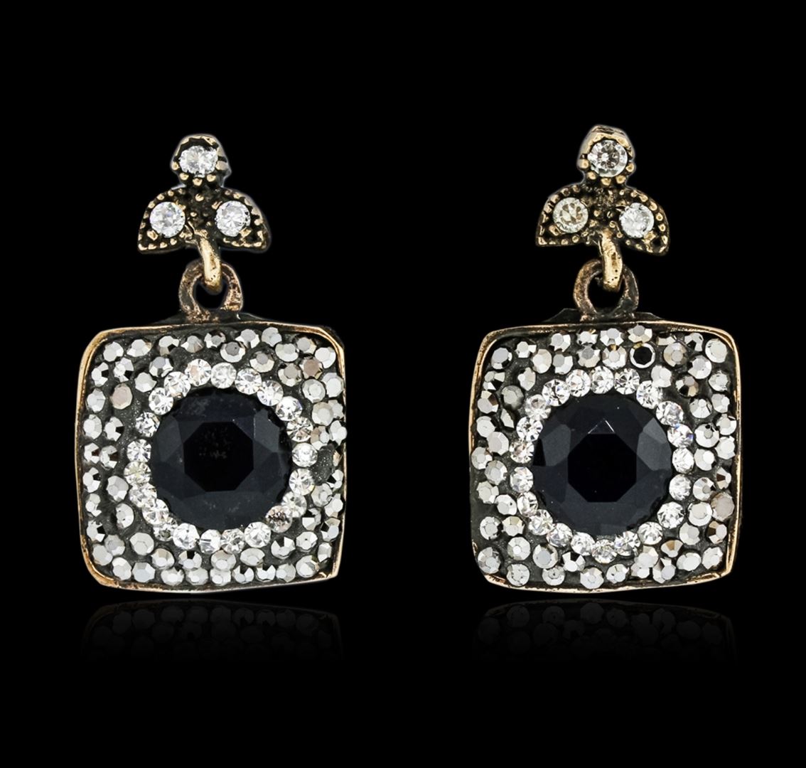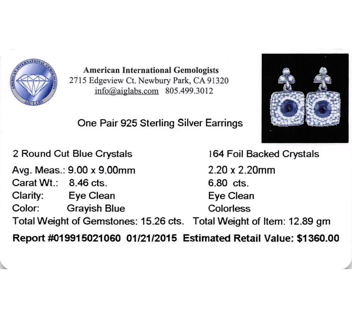 One pair electronically tested 925 silver ladies custom cast & assembled dangle earrings with standard backs. Bright and anodized finish with yellow gold accents. Identified with markings of "925". Condition is new, good workmanship. Containing: Two prong set round mixed cut laboratory created blue crystals, measuring 9.00 - 9.00 x 4.50 mm, approximate total weight of 8.46ct., clarity is eye clean, very dark, very slightly grayish, blue color, (GIA B 8/3), cut is good. Six prong set round brilliant cut laboratory created cubic zirconias, measuring 2.20 - 2.20 x 1.43 mm, approximate total weight of 0.48ct., clarity is eye clean, colorless, very slightly grayish, white color, (GIA W 0/3), cut is good. One hundred fifty-eight round mixed cut laboratory created white and black foil backs, measuring 1.80 - 1.50 x 1.07 mm, approximate total weight of 6.32ct., clarity is eye clean, cut is good. Total Weight of Colored Stones 15.26ct. Total Weight of Earrings 12.89 grams. AIG Appraised at $1,360.00.