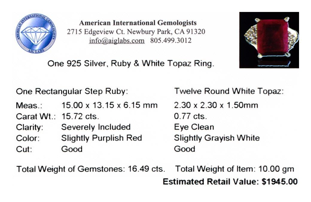 One ring featuring: 10.00 grams of sterling silver and (1) ruby measuring: 15.00 x 13.15 x 6.15mm, carat weight 15.72, color slightly purplish red and (12) round white topaz carat weight: 0.77cts, color: slightly grayish white. AIG Appraised at $1,945.00.